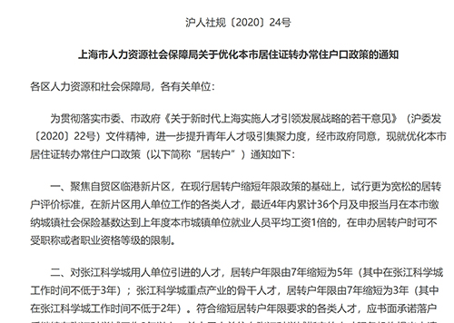 關(guān)于優(yōu)化本市居住證轉(zhuǎn)辦常住戶口政策的通知 各區(qū)人力資源和社會保障局,各有關(guān)單位: 為貫徹落實市委、市政府《關(guān)于新時代上海實施人才引領(lǐng)發(fā)展戰(zhàn)略的若干意見》(滬委發(fā)〔2020〕22號)文件精神,進一步提升青年人才吸引集聚力度,經(jīng)市政府同意,現(xiàn)就優(yōu)化本市居住證轉(zhuǎn)辦常住戶口政策(以下簡稱“居轉(zhuǎn)戶”)通知如下: 一、聚焦自貿(mào)區(qū)臨港新片區(qū),在現(xiàn)行居轉(zhuǎn)戶縮短年限政策的基礎(chǔ)上,試行更為寬松的居轉(zhuǎn)戶評價標(biāo)準(zhǔn),在新片區(qū)用人單位工作的各類人才,最近4年內(nèi)累計36個月及申報當(dāng)月在本市繳納城鎮(zhèn)社會保險基數(shù)達到上年度本市城鎮(zhèn)單位就業(yè)人員平均工資1倍的,在申辦居轉(zhuǎn)戶時可不受職稱或者職業(yè)資格等級的限制。 二、對張江科學(xué)城用人單位引進的人才,居轉(zhuǎn)戶年限由7年縮短為5年(其中在張江科學(xué)城工作時間不低于3年);張江科學(xué)城重點產(chǎn)業(yè)的骨干人才,居轉(zhuǎn)戶年限由7年縮短為3年(其中在張江科學(xué)城工作時間不低于2年)。符合縮短居轉(zhuǎn)戶年限要求的各類人才,應(yīng)書面承諾落戶后繼續(xù)在張江科學(xué)城工作2年以上,并由用人單位向張江科學(xué)城指定的人才服務(wù)機構(gòu)提出申請后(推薦表樣式見附件),按本市居轉(zhuǎn)戶規(guī)定進行申報。 三、在本市行政區(qū)域內(nèi)注冊的用人單位工作并持有《上海市居住證》的境內(nèi)人員,最近4年內(nèi)累計36個月及申報當(dāng)月在本市繳納城鎮(zhèn)社會保險基數(shù)達到上年度本市城鎮(zhèn)單位就業(yè)人員平均工資2倍的,在申辦居轉(zhuǎn)戶時可不受職稱或者職業(yè)資格等級的限制。 四、在本市被評聘為中級職稱或者具有技師(國家二級職業(yè)資格證書)職業(yè)資格的人員申辦居轉(zhuǎn)戶的,應(yīng)達到一定的市場化評價標(biāo)準(zhǔn)。 本通知自2020年12月1日起施行,有效期至2024年12月31日。 附件:張江科學(xué)城持有《上海市居住證》人員申辦本市常住戶口推薦表 上海市人力資源和社會保障局 2020年11月13日 |