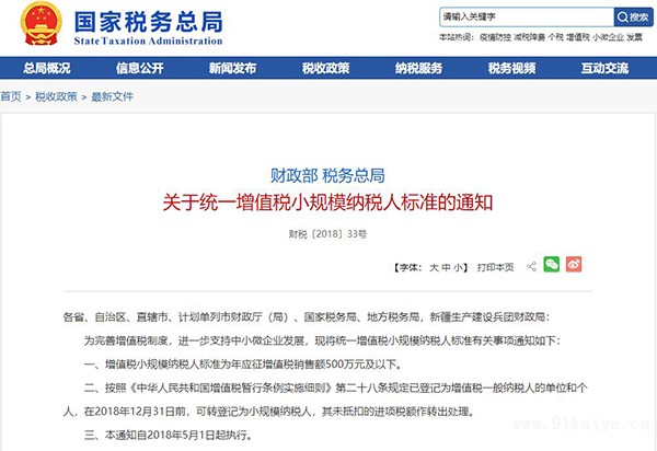 關(guān)于統(tǒng)一增值稅小規(guī)模納稅人標準的通知 各省、自治區(qū)、直轄市、計劃單列市財政廳(局)、國家稅務(wù)局、地方稅務(wù)局,新疆生產(chǎn)建設(shè)兵團財政局: 為完善增值稅制度,進一步支持中小微企業(yè)發(fā)展,現(xiàn)將統(tǒng)一增值稅小規(guī)模納稅人標準有關(guān)事項通知如下: 一、增值稅小規(guī)模納稅人標準為年應(yīng)征增值稅銷售額500萬元及以下。 二、按照《中華人民共和國增值稅暫行條例實施細則》第二十八條規(guī)定已登記為增值稅一般納稅人的單位和個人,在2018年12月31日前,可轉(zhuǎn)登記為小規(guī)模納稅人,其未抵扣的進項稅額作轉(zhuǎn)出處理。 三、本通知自2018年5月1日起執(zhí)行。 以上是91開業(yè)網(wǎng)小編為您整理的關(guān)于小規(guī)模納稅人標準的內(nèi)容,希望對您有所幫助。 |