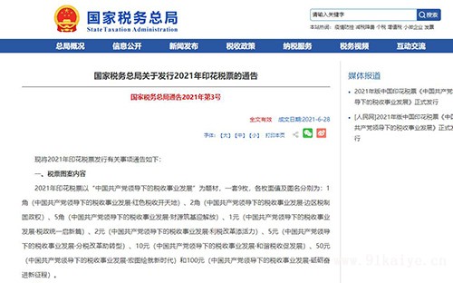 現(xiàn)將2021年印花稅票發(fā)行有關(guān)事項通告如下: 一、稅票圖案內(nèi)容 2021年印花稅票以“中國共產(chǎn)黨領(lǐng)導下的稅收事業(yè)發(fā)展”為題材,一套9枚,各枚面值及圖名分別為:1角(中國共產(chǎn)黨領(lǐng)導下的稅收事業(yè)發(fā)展·紅色稅收開天地)、2角(中國共產(chǎn)黨領(lǐng)導下的稅收事業(yè)發(fā)展·邊區(qū)稅制固政權(quán))、5角(中國共產(chǎn)黨領(lǐng)導下的稅收事業(yè)發(fā)展·財源筑基迎解放)、1元(中國共產(chǎn)黨領(lǐng)導下的稅收事業(yè)發(fā)展·稅政統(tǒng)一啟新篇)、2元(中國共產(chǎn)黨領(lǐng)導下的稅收事業(yè)發(fā)展·利稅改革添活力)、5元(中國共產(chǎn)黨領(lǐng)導下的稅收事業(yè)發(fā)展·分稅改革助轉(zhuǎn)型)、10元(中國共產(chǎn)黨領(lǐng)導下的稅收事業(yè)發(fā)展·和諧稅收促發(fā)展)、50元(中國共產(chǎn)黨領(lǐng)導下的稅收事業(yè)發(fā)展·宏圖繪就新時代)和100元(中國共產(chǎn)黨領(lǐng)導下的稅收事業(yè)發(fā)展·砥礪奮進新征程)。 印花稅票圖案左上角有鏤空篆體“稅”字。各枚印花稅票底邊左側(cè)印有“中國印花稅票”和“2021”字樣,中部印有圖名,右側(cè)印有面值和按票面金額大小排列的順序號(9-X)。 二、稅票規(guī)格 2021年印花稅票打孔尺寸為50mm×38mm,齒孔度數(shù)為13×12.5。20枚1張,每張尺寸280mm×180mm,左右兩側(cè)出孔到邊。 三、稅票防偽措施 (一)采用啞鈴異形齒孔,左右兩邊居中; (二)圖內(nèi)紅版全部采用特制防偽油墨; (三)每張噴有7位連續(xù)墨號; (四)其他技術(shù)及紙張防偽措施。 四、其他事項 2021年印花稅票自本通告發(fā)布之日起啟用,以前年度發(fā)行的各版印花稅票仍然有效。 特此通告。 國家稅務總局 2021年6月28日 |