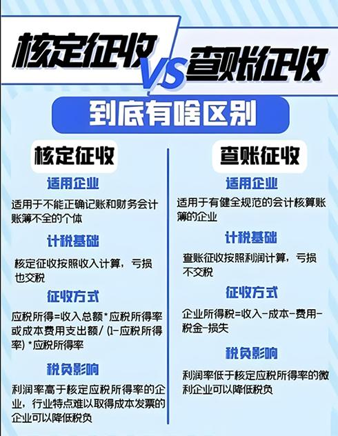 查賬征收和核定征收區(qū)別 1、計稅依據(jù)不同 計稅依據(jù)是查賬征收與核定征收最大的區(qū)別,查賬征收是以所得稅額為計稅依據(jù)的,可以簡單的為以利潤為計稅依據(jù)。核定征收是以收入*征定率得出的所得稅額為計稅依據(jù)。 2、申報表不同 查賬征收的申報表是a類報表,核定征收的申報表是b類報表。 3、填寫內(nèi)容不同 查賬征收需要填寫,收入、成本、利潤總額。核定征收只需要填收入即可。 4、匯算清繳不同 查賬征收的匯算清繳相當(dāng)?shù)穆闊,需要計算各種費用的標(biāo)準(zhǔn),以及提出超額的費用。核定征收相對比較簡單,只需算準(zhǔn)收入即可。 5、財務(wù)管理不同 查賬征收適用與財務(wù)管理健全的企業(yè),核定征收是用于財務(wù)管理不健全,成本或者費用無法準(zhǔn)確計算的企業(yè)。 6、選擇企業(yè)不同 選擇企業(yè)不同,主要是指企業(yè)是一般納稅人,還是小規(guī)模納稅人。簡單的來說就是,通常查賬征收適用于一般納稅人,核定征收適用于,成本或費用無法準(zhǔn)確計算的小規(guī)模企業(yè)。 7、所得稅率一樣 雖然查賬征收與核定征收有很多的區(qū)別,但是他們的所得稅率是相同的。就是一般稅率是25%,優(yōu)惠稅率可以簡單的理解為10%。 以上是玖邀開業(yè)網(wǎng)小編為您整理的關(guān)于查賬征收和核定征收的區(qū)別是什么的內(nèi)容,希望對您有所幫助。 |