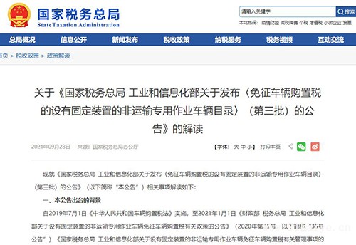 現(xiàn)就《國家稅務(wù)總局 工業(yè)和信息化部關(guān)于發(fā)布〈免征車輛購置稅的設(shè)有固定裝置的非運(yùn)輸專用作業(yè)車輛目錄〉(第三批)的公告》(以下簡(jiǎn)稱“本公告”)相關(guān)事項(xiàng)解讀如下: 一、本公告出臺(tái)的背景 自2019年7月1日《中華人民共和國車輛購置稅法》實(shí)施,至2021年1月1日《財(cái)政部 稅務(wù)總局 工業(yè)和信息化部關(guān)于設(shè)有固定裝置的非運(yùn)輸專用作業(yè)車輛免征車輛購置稅有關(guān)政策的公告》(2020年第35號(hào),以下簡(jiǎn)稱“35號(hào)公告”)《國家稅務(wù)總局 工業(yè)和信息化部關(guān)于設(shè)有固定裝置的非運(yùn)輸專用作業(yè)車輛免征車輛購置稅有關(guān)管理事項(xiàng)的公告》(2020年第20號(hào),以下簡(jiǎn)稱“20號(hào)公告”)實(shí)施,稅務(wù)總局參照交通部門以往的管理模式規(guī)定,設(shè)有固定裝置的非運(yùn)輸專用作業(yè)車輛(以下簡(jiǎn)稱“專用車輛”)免征車輛購置稅實(shí)行以下工作機(jī)制,即由相關(guān)企業(yè)通過工業(yè)和信息化部信息采集系統(tǒng),提交將車型列入《設(shè)有固定裝置的非運(yùn)輸專用作業(yè)車輛免稅圖冊(cè)》(以下簡(jiǎn)稱《免稅圖冊(cè)》)的申請(qǐng),工信部將相關(guān)信息傳遞給稅務(wù)總局,稅務(wù)總局審核編列發(fā)布《免稅圖冊(cè)》,納稅人依據(jù)《免稅圖冊(cè)》向主管稅務(wù)機(jī)關(guān)申請(qǐng)免稅。 為切實(shí)落實(shí)國務(wù)院“放管服”改革要求,優(yōu)化稅務(wù)執(zhí)法方式,提高納稅服務(wù)水平,更好地維護(hù)納稅人權(quán)益,進(jìn)一步提高專用車輛免稅管理的精確性、便捷性和及時(shí)性,35號(hào)公告和20號(hào)公告進(jìn)一步優(yōu)化專用車輛免稅管理機(jī)制,對(duì)專用車輛實(shí)行《免征車輛購置稅的設(shè)有固定裝置的非運(yùn)輸專用作業(yè)車輛目錄》(以下簡(jiǎn)稱《目錄》)管理,車輛生產(chǎn)企業(yè)、進(jìn)口車輛經(jīng)銷商或個(gè)人(以下簡(jiǎn)稱“申請(qǐng)人”)按要求通過工信部“免征車輛購置稅的設(shè)有固定裝置的非運(yùn)輸專用作業(yè)車輛管理系統(tǒng)”,提交將車型列入《目錄》的申請(qǐng)材料,國家稅務(wù)總局、工業(yè)和信息化部委托工業(yè)和信息化部裝備工業(yè)發(fā)展中心(以下簡(jiǎn)稱“裝備中心”)對(duì)申請(qǐng)人所提交的申請(qǐng)材料進(jìn)行技術(shù)審查。裝備中心按照《設(shè)有固定裝置的非運(yùn)輸專用作業(yè)車輛技術(shù)要求》(以下簡(jiǎn)稱《技術(shù)要求》)依規(guī)開展技術(shù)審查,并將通過審查的車型列入擬發(fā)布的《目錄》并提請(qǐng)國家稅務(wù)總局、工業(yè)和信息化部發(fā)布《目錄》。對(duì)列入《目錄》的車型,申請(qǐng)人在上傳車輛電子信息時(shí)標(biāo)注免稅標(biāo)識(shí),主管稅務(wù)機(jī)關(guān)依據(jù)車輛電子信息中標(biāo)注的免稅標(biāo)識(shí)辦理免稅事宜。 二、《目錄》涵蓋的企業(yè)和車型 包括本批《目錄》在內(nèi),2021年以來共發(fā)布了三批《目錄》。第一批《目錄》涵蓋了244家企業(yè)的3487個(gè)車型,第二批《目錄》涵蓋了303家企業(yè)的1931個(gè)車型,第三批《目錄》涵蓋了275家企業(yè)的1105個(gè)車型。三批《目錄》共涵蓋了822家企業(yè)的6523個(gè)車型。 三、車型未通過技術(shù)審查后申請(qǐng)人如何處理 (一)車型未通過技術(shù)審查的幾種情形 申請(qǐng)人通過申報(bào)系統(tǒng)提交相關(guān)資料。對(duì)不符合技術(shù)要求、材料提交不全或者填寫有誤的車型,裝備中心給予“不通過”的結(jié)論。舉例說明: 1.甲公司申請(qǐng)將XXX型吸引壓送車列入《目錄》,該車輛額定載質(zhì)量(生產(chǎn)廠家為車輛設(shè)定的最大允許裝載質(zhì)量)12000kg!都夹g(shù)要求》規(guī)定,額定載質(zhì)量大于或等于1000kg的專項(xiàng)作業(yè)車輛,不屬于專用車輛。 2.乙公司申請(qǐng)將進(jìn)口的XXX型機(jī)場(chǎng)用道路跑道清掃車列入《目錄》;該車輛以機(jī)場(chǎng)設(shè)備進(jìn)口,該公司未按照20號(hào)公告的要求提供車輛一致性證書等注明車輛額定載客人數(shù)、總質(zhì)量、額定載質(zhì)量等參數(shù)的材料。 3.丙公司申請(qǐng)將XXX型檢測(cè)車列入《目錄》,該公司未按照20號(hào)公告的要求,在《設(shè)有固定裝置的非運(yùn)輸專用作業(yè)車輛信息采集表》填寫該車輛額定載客人數(shù);該車輛額定載質(zhì)量小于1000kg,專用裝置在車廂地板上的投影面積小于50%,《技術(shù)要求》規(guī)定,額定載質(zhì)量小于1000kg,但車廂內(nèi)固定安裝的專用設(shè)備或者器具等固定裝置,在車廂地板上投影的面積小于車廂地板面積(不含駕駛區(qū)面積)50%的車輛(用于放置移動(dòng)專用設(shè)備或者器具的貨架投影面積不計(jì)算在內(nèi))不屬于專用車輛。 (二)車型未通過技術(shù)審查后申請(qǐng)人如何處理 第一步,若申請(qǐng)人不認(rèn)可裝備中心技術(shù)審查結(jié)論,可以通過申報(bào)系統(tǒng)隨時(shí)重新申報(bào);在重新申報(bào)時(shí),可對(duì)裝備中心技術(shù)審查結(jié)論提出自己的意見,并提供相應(yīng)的佐證材料;裝備中心重新給予技術(shù)審查結(jié)論。 第二步,若申請(qǐng)人仍不認(rèn