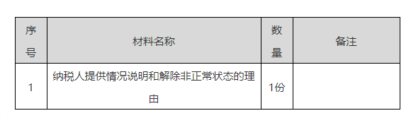 【事項名稱】 非正常戶解除 【申請條件】 被稅務(wù)機關(guān)認定為非正常戶的納稅人,需恢復(fù)履行納稅義務(wù)的,向稅務(wù)機關(guān)提出辦理解除非正常戶。 【設(shè)定依據(jù)】 1.《國家稅務(wù)總局關(guān)于進一步完善稅務(wù)登記管理有關(guān)問題的公告》(國家稅務(wù)總局公告2011年第21號) 2.《稅務(wù)登記管理辦法》(國家稅務(wù)總局令第7號公布,國家稅務(wù)總局令第36號、第44號、第48號修改) 【辦理材料】 【辦理地點】 可通過辦稅服務(wù)廳辦理。 【辦理機構(gòu)】 主管稅務(wù)機關(guān) 【收費標(biāo)準(zhǔn)】 不收費 【辦理時間】 即時辦結(jié) 【聯(lián)系電話】 (021)12366 【辦理流程】 【納稅人注意事項】 1.納稅人對報送材料的真實性和合法性承擔(dān)責(zé)任。 2.對于已經(jīng)由稅務(wù)機關(guān)按照政策規(guī)定和流程解除非正常戶的納稅人,主管稅務(wù)機關(guān)應(yīng)當(dāng)在2個工作日內(nèi)恢復(fù)其稅控系統(tǒng)開票功能,保障納稅人正常開具發(fā)票。 3.處于非正常戶狀態(tài)納稅人在辦理稅務(wù)注銷前,須先解除非正常狀態(tài)。 |