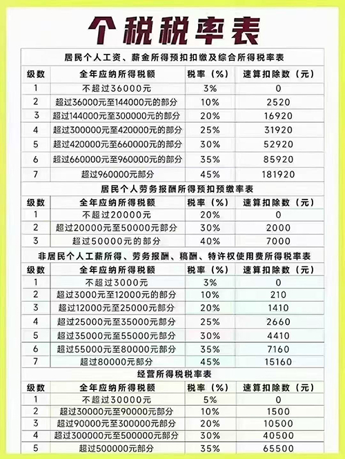 個(gè)稅繳費(fèi)稅率 1、全月應(yīng)納稅所得額不超過3000元 : 稅率:3%;速算扣除數(shù)(元):0 2、全月應(yīng)納稅所得額超過3000元至12000元: 稅率:10%;速算扣除數(shù)(元):210 3、全月應(yīng)納稅所得額超過12000元至25000元: 稅率:20%;速算扣除數(shù)(元):1410 4、全月應(yīng)納稅所得額超過25000元至35000元: 稅率:25%;速算扣除數(shù)(元):2660 5、全月應(yīng)納稅所得額超過35000元至55000元: 稅率:30%;速算扣除數(shù)(元):4410 6、全月應(yīng)納稅所得額超過55000元至80000元: 稅率:35%;速算扣除數(shù)(元):7160 7、全月應(yīng)納稅所得額超過80000元: 稅率:45%;速算扣除數(shù)(元):15160 以上是玖邀開業(yè)網(wǎng)小編為您整理的關(guān)于個(gè)稅繳費(fèi)稅率的內(nèi)容,希望對(duì)您有所幫助。 |