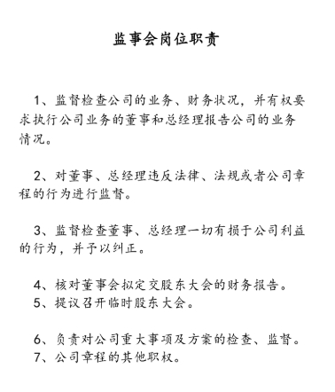 監(jiān)事會是股份公司的常設(shè)監(jiān)督機構(gòu)。監(jiān)事會的監(jiān)事由股東大會選舉產(chǎn)生,代表股東大會執(zhí)行監(jiān)督職能。監(jiān)事會在任職期間承擔(dān)相應(yīng)的責(zé)任,那么監(jiān)事會職責(zé)有哪些,監(jiān)事會議事規(guī)則是怎樣的呢? 一、監(jiān)事會議事規(guī)則 1、監(jiān)事會的召集和主持 監(jiān)事會會議應(yīng)當(dāng)由有召集主持權(quán)的人召集和主持。 有限責(zé)任公司監(jiān)事會會議由監(jiān)事會主席召集和主持;監(jiān)事會主席不能履行職務(wù)或者不履行職務(wù)的,由半數(shù)以上監(jiān)事共同推舉一名監(jiān)事召集和主持監(jiān)事會議。股份有限公司的監(jiān)事會主席不能履行職時,還可以由監(jiān)事會副主席召集和主持。 2、監(jiān)事會會議的表決方式 監(jiān)事會決議是多數(shù)通過原則,應(yīng)當(dāng)經(jīng)半數(shù)以上監(jiān)事通過。監(jiān)事會表決事項實行“一人一票”原則。 監(jiān)事會職責(zé)有哪些,監(jiān)事會議事規(guī)則是怎樣的 二、監(jiān)事會的職責(zé) 監(jiān)事會(或不設(shè)監(jiān)事會的公司的監(jiān)事)行使下列職權(quán): (一)檢查公司財務(wù); (二)對董事、高級管理人員執(zhí)行公司職務(wù)的行為進行監(jiān)督,對違反法律、行政法規(guī)、公司章程或者股東會決議的董事、高級管理人員提出罷免的建議; (三)當(dāng)董事、高級管理人員的行為損害公司的利益時,要求董事、高級管理人員予以糾正; (四)提議召開臨時股東會會議,在董事會不履行《公司法》規(guī)定的召集和主持股東會會議職責(zé)時召集和主持股東會會議; (五)向股東會會議提出提案; (六)依照《公司法》第一百五十一條的規(guī)定,對董事、高級管理人員提起訴訟; (七)列席董事會會議,對所以議事項提出質(zhì)詢和建議; (八)發(fā)現(xiàn)公司經(jīng)營情況; (九)公司章程規(guī)定的其他職權(quán)。 三、公司法對于監(jiān)事會議事規(guī)則的規(guī)定 第五十二條 監(jiān)事的任期每屆為三年。監(jiān)事任期屆滿,連選可以連任。 監(jiān)事任期屆滿未及時改選,或者監(jiān)事在任期內(nèi)辭職導(dǎo)致監(jiān)事會成員低于法定人數(shù)的,在改選出的監(jiān)事就任前,原監(jiān)事仍應(yīng)當(dāng)依照法律、行政法規(guī)和公司章程的規(guī)定,履行監(jiān)事職務(wù)。 第五十三條 監(jiān)事會、不設(shè)監(jiān)事會的公司的監(jiān)事行使下列職權(quán): (一)檢查公司財務(wù); (二)對董事、高級管理人員執(zhí)行公司職務(wù)的行為進行監(jiān)督,對違反法律、行政法規(guī)、公司章程或者股東會決議的董事、高級管理人員提出罷免的建議; (三)當(dāng)董事、高級管理人員的行為損害公司的利益時,要求董事、高級管理人員予以糾正; (四)提議召開臨時股東會會議,在董事會不履行本法規(guī)定的召集和主持股東會會議職責(zé)時召集和主持股東會會議; (五)向股東會會議提出提案; (六)依照本法第一百五十一條的規(guī)定,對董事、高級管理人員提起訴訟; (七)公司章程規(guī)定的其他職權(quán)。 第五十四條 監(jiān)事可以列席董事會會議,并對董事會決議事項提出質(zhì)詢或者建議。 監(jiān)事會、不設(shè)監(jiān)事會的公司的監(jiān)事發(fā)現(xiàn)公司經(jīng)營情況異常,可以進行調(diào)查;必要時,可以聘請會計師事務(wù)所等協(xié)助其工作,費用由公司承擔(dān)。 第五十五條 監(jiān)事會每年度至少召開一次會議,監(jiān)事可以提議召開臨時監(jiān)事會會議。 監(jiān)事會的議事方式和表決程序,除本法有規(guī)定的外,由公司章程規(guī)定。 監(jiān)事會決議應(yīng)當(dāng)經(jīng)半數(shù)以上監(jiān)事通過。 監(jiān)事會應(yīng)當(dāng)對所議事項的決定作成會議記錄,出席會議的監(jiān)事應(yīng)當(dāng)在會議記錄上簽名。 第五十六條 監(jiān)事會、不設(shè)監(jiān)事會的公司的監(jiān)事行使職權(quán)所必需的費用,由公司承擔(dān)。 以上是玖邀開業(yè)網(wǎng)小編為您整理的關(guān)于監(jiān)事會職責(zé)有哪些,監(jiān)事會議事規(guī)則是怎樣的的內(nèi)容,希望對您有所幫助。 |