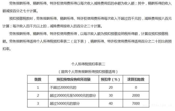勞務(wù)報(bào)酬是個(gè)人獨(dú)立從事勞務(wù)取得的報(bào)酬,也是需要繳納個(gè)稅的,跟工資薪金的計(jì)算稅額的方式有所差異,那么勞務(wù)費(fèi)的個(gè)人所得稅是怎么算的呢? 勞務(wù)費(fèi)個(gè)稅怎么算? 勞務(wù)報(bào)酬所得以每次收入減除費(fèi)用后的余額為收入額,勞務(wù)報(bào)酬收入不超過(guò)4000元,減除費(fèi)用按800元計(jì)算;收入超過(guò)4000元,減除費(fèi)用按收入的20%計(jì)算。勞務(wù)費(fèi)個(gè)稅的計(jì)算公式為:預(yù)扣稅額=應(yīng)納稅所得額×預(yù)扣率-速算扣除數(shù)。 【1】勞務(wù)報(bào)酬不超過(guò)800元,預(yù)扣稅額為0元。 【2】勞務(wù)報(bào)酬大于800但不超過(guò)4000元,假設(shè)取得勞務(wù)報(bào)酬4000元,預(yù)扣稅額=(4000-800)×20%=640元。 【3】勞務(wù)報(bào)酬大于4000元但不超過(guò)20000元,假設(shè)取得勞務(wù)報(bào)酬10000元,預(yù)扣稅額=10000×(1-20%)×20%=1600元。 【4】勞務(wù)報(bào)酬大于20000元但不超過(guò)50000元,假設(shè)取得勞務(wù)報(bào)酬40000元,預(yù)扣稅額=40000×(1-20%)×30%-2000=7600元。 【5】勞務(wù)報(bào)酬大于50000元,假設(shè)取得勞務(wù)報(bào)酬80000元,預(yù)扣稅額=80000×(1-20%)×40%-7000=18600元。 勞務(wù)費(fèi)個(gè)稅由扣繳義務(wù)人代為預(yù)扣預(yù)繳,年度終了,納稅人可自行通過(guò)個(gè)人所得稅APP辦理匯算清繳,多退少補(bǔ)。 以上是玖邀開(kāi)業(yè)網(wǎng)小編為您整理的關(guān)于勞務(wù)費(fèi)個(gè)稅怎么算 附勞務(wù)報(bào)酬所得預(yù)扣率表的內(nèi)容,希望對(duì)您有所幫助。 |