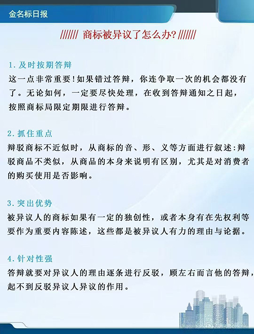 如何處理商標異議 注冊商標是一個非常漫長的過程,等待商標申請的初審并不容易。搜索結(jié)果顯示,該商標在網(wǎng)絡上遭到了他人的批評,這勢必會讓人情緒低落。那么如何處理商標異議呢?商標異議要收費嗎? 任何個人都可以在公告期內(nèi)對商標提出異議,這是法律賦予的權利。只能做一個異議回復。 異議所需材料:商標代理委托書原件、答辯理由、答辯通知書或評估證據(jù)交換通知書。被申請人的資格證明及能夠支持被申請人理由的相關證據(jù)材料(證據(jù)材料清單應在簽訂代理協(xié)議后一個工作日內(nèi)出具)。 1.異議:填寫《商標異議書》,寫明名稱、商品類別、初步審定號、初步審定公告期號、異議理由。認為被異議商標與異議人在同一種或者類似商品上使用的注冊商標相同或者近似的,還應當填寫異議人注冊商標的商品類別、商標名稱和注冊號。 2.答辯通知:商標局收到異議及相關證據(jù)后,將異議副本發(fā)送被申請人,被申請人應當自收到異議之日起,在指定期限內(nèi)作出書面答辯。異議人逾期不答辯的,視為放棄。且不影響異議程序進行。 3.補正(不必要的過程):商標局收到異議申請后,如發(fā)現(xiàn)異議申請存在需要補正的問題,將向異議人或商標代理機構(gòu)發(fā)出補正通知書,限期補正。 4.作出裁定:商標局應當聽取異議人和被異議人陳述的事實和理由,經(jīng)調(diào)查核實后作出裁定。 2.商標異議要收費嗎? 商標異議是指商標所有人和利害關系人對國家商標局初步審定并公告的商標,在公告期內(nèi)向國家商標局提出的申請,即請求商標局撤銷商標初步審定,不予核準注冊的程序。商標異議費(國家收費標準)?商標異議費標準,也就是向中國商標局申請的費用,是1000元,是全國統(tǒng)一的行政事業(yè)性收費。當然,大部分客戶還是會選擇代理機構(gòu)提出商標異議申請,代理費在1500-3000區(qū)間(主要看案件難度),這是商標異議所有費用的使用。商標異議時間段:從收到異議之日起至異議審查結(jié)束,整個過程大約需要2年時間,但在異議期內(nèi),對方不能取得商標注冊證。 商標被異議怎么辦? 商標異議是指公眾對該商標經(jīng)初步審查并公告后,在法定期限內(nèi)向商標局提出不予注冊的* *意見。被異議商標在3個月的公告期內(nèi),商標局將聽取異議人和被異議人陳述的事實和理由,經(jīng)調(diào)查核實后,在公告期滿之日起12個月內(nèi)作出是否核準注冊的決定,并書面通知異議人和被異議人。反對者應以充分的理由回應反對者提出的理由,并爭取成功注冊。 商標局做出不予注冊決定,異議人不服的,可以在收到通知之日起十五天內(nèi)向商標評審委員會申請復審。商標評審* * *應當自收到申請之日起十二個月內(nèi)作出評審決定,并書面通知異議人和被異議人。有特殊情況需要延長的,經(jīng)國務院工商行政管理部門批準,可以延長六個月。異議人對商標復審決定不服的,可以提起訴訟 對初步審定后公告的商標提出異議的,商標局應當聽取異議人和被異議人陳述的事實和理由,經(jīng)調(diào)查核實后,自公告期滿之日起十二個月內(nèi)作出是否核準注冊的決定,并書面通知被異議人和被異議人。有特殊情況需要延長的,經(jīng)國務院工商行政管理部門批準,可以延長六個月。 以上是玖邀開業(yè)網(wǎng)小編為您整理的關于如何處理商標異議的內(nèi)容,希望對您有所幫助。 |