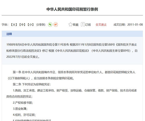 中華人民共和國(guó)印花稅暫行條例 第一條 在中華人民共和國(guó)境內(nèi)書(shū)立、領(lǐng)受本條例所列舉憑證的單位和個(gè)人,都是印花稅的納稅義務(wù)人(以下簡(jiǎn)稱(chēng)納稅人),應(yīng)當(dāng)按照本條例規(guī)定繳納印花稅。 第二條 下列憑證為應(yīng)納稅憑證: 1.購(gòu)銷(xiāo)、加工承攬、建設(shè)工程承包、財(cái)產(chǎn)租賃、貨物運(yùn)輸、倉(cāng)儲(chǔ)保管、借款、財(cái)產(chǎn)保險(xiǎn)、技術(shù)合同或者具有合同性質(zhì)的憑證; 2.產(chǎn)權(quán)轉(zhuǎn)移書(shū)據(jù); 3.營(yíng)業(yè)賬簿; 4.權(quán)利、許可證照; 5.經(jīng)財(cái)政部確定征稅的其他憑證。 第三條 納稅人根據(jù)應(yīng)納稅憑證的性質(zhì),分別按比例稅率或者按件定額計(jì)算應(yīng)納稅額。具體稅率、稅額的確定,依照本條例所附《印花稅稅目稅率表》執(zhí)行。 應(yīng)納稅額不足一角的,免納印花稅。 應(yīng)納稅額在一角以上的,其稅額尾數(shù)不滿(mǎn)五分的不計(jì),滿(mǎn)五分的按一角計(jì)算繳納。 第四條 下列憑證免納印花稅: 1.已繳納印花稅的憑證的副本或者抄本; 2.財(cái)產(chǎn)所有人將財(cái)產(chǎn)贈(zèng)給政府、社會(huì)福利單位、學(xué)校所立的書(shū)據(jù); 3.經(jīng)財(cái)政部批準(zhǔn)免稅的其他憑證。 第五條 印花稅實(shí)行由納稅人根據(jù)規(guī)定自行計(jì)算應(yīng)納稅額,購(gòu)買(mǎi)并一次貼足印花稅票(以下簡(jiǎn)稱(chēng)貼花)的繳納辦法。 為簡(jiǎn)化貼花手續(xù),應(yīng)納稅額較大或者貼花次數(shù)頻繁的,納稅人可向稅務(wù)機(jī)關(guān)提出申請(qǐng),采取以繳款書(shū)代替貼花或者按期匯總繳納的辦法。 第六條 印花稅票應(yīng)當(dāng)粘貼在應(yīng)納稅憑證上,并由納稅人在每枚稅票的騎縫處蓋戳注銷(xiāo)或者畫(huà)銷(xiāo)。 已貼用的印花稅票不得重用。 第七條 應(yīng)納稅憑證應(yīng)當(dāng)于書(shū)立或者領(lǐng)受時(shí)貼花。 第八條 同一憑證,由兩方或者兩方以上當(dāng)事人簽訂并各執(zhí)一份的,應(yīng)當(dāng)由各方就所執(zhí)的一份各自全額貼花。 第九條 已貼花的憑證,修改后所載金額增加的,其增加部分應(yīng)當(dāng)補(bǔ)貼印花稅票。 第十條 印花稅由稅務(wù)機(jī)關(guān)負(fù)責(zé)征收管理。 第十一條 印花稅票由國(guó)家稅務(wù)局監(jiān)制。票面金額以人民幣為單位。 第十二條 發(fā)放或者辦理應(yīng)納稅憑證的單位,負(fù)有監(jiān)督納稅人依法納稅的義務(wù)。 第十三條 納稅人有下列行為之一的,由稅務(wù)機(jī)關(guān)根據(jù)情節(jié)輕重,予以處罰: 1.在應(yīng)納稅憑證上未貼或者少貼印花稅票的,稅務(wù)機(jī)關(guān)除責(zé)令其補(bǔ)貼印花稅票外,可處以應(yīng)補(bǔ)貼印花稅票金額20倍以下的罰款; 2.違反本條例第六條第一款規(guī)定的,稅務(wù)機(jī)關(guān)可處以未注銷(xiāo)或者畫(huà)銷(xiāo)印花稅票金額10倍以下的罰款; 3.違反本條例第六條第二款規(guī)定的,稅務(wù)機(jī)關(guān)可處以重用印花稅票金額30倍以下的罰款。 偽造印花稅票的,由稅務(wù)機(jī)關(guān)提請(qǐng)司法機(jī)關(guān)依法追究刑事責(zé)任。 第十四條 印花稅的征收管理,除本條例規(guī)定者外,依照《中華人民共和國(guó)稅收征收管理暫行條例》的有關(guān)規(guī)定執(zhí)行。 第十五條 本條例由財(cái)政部負(fù)責(zé)解釋?zhuān)皇┬屑?xì)則由財(cái)政部制定。 第十六條 本條例自1988年10月1日起施行。 |