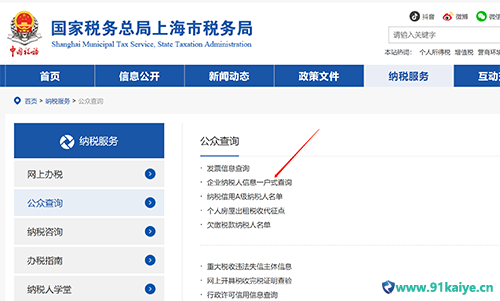: 一般納稅人資格查詢方法介紹(如何查看企業(yè)是否是一般納稅人)1、登錄所在省、市的稅務(wù)局官網(wǎng),點擊我要查詢下面以上海市為教程(如圖)2、點擊企業(yè)納稅人一戶式查詢(如圖)3、輸入需要查詢的公司名稱和圖片驗證碼 ...
