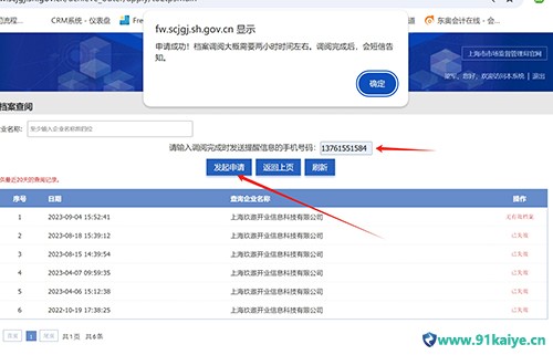 第六步:填寫手機(jī)號(hào)碼,發(fā)起申請(qǐng)留意手機(jī)短信,檔案調(diào)取成功后,會(huì)短信提醒。