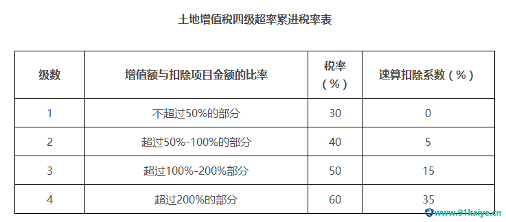 : 根據(jù)《中華人民共和國土地增值稅暫行條例》可看出:土地增值稅實(shí)行四級超率累進(jìn)稅率:增值額未超過扣除項(xiàng)目金額50%的部分,稅率為30%。增值額超過扣除項(xiàng)目金額50%、未超過扣除項(xiàng)目金額100%的部分,稅率為40%。增值額 ...
