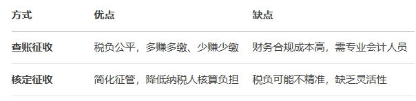 查賬征收和核定征收是兩種不同的稅款征收方式,主要區(qū)別在于計(jì)稅依據(jù)、適用對(duì)象、征管要求等方面。以下是具體對(duì)比: 1. 計(jì)稅依據(jù)不同 - 查賬征收 - 依據(jù)真實(shí)賬務(wù):以納稅人提供的會(huì)計(jì)賬簿、憑證、財(cái)務(wù)報(bào)表等真實(shí)記錄為基礎(chǔ),按實(shí)際收入、成本、利潤等計(jì)算應(yīng)納稅額。 - 公式:應(yīng)納稅額 = (收入 - 成本 - 費(fèi)用等)× 適用稅率。 - 特點(diǎn):依賴企業(yè)財(cái)務(wù)核算的完整性和準(zhǔn)確性。 - 核定征收 - 依據(jù)核定標(biāo)準(zhǔn):稅務(wù)機(jī)關(guān)因納稅人賬務(wù)不健全或其他原因,直接核定其應(yīng)納稅額。核定方式包括: - 定額征收:直接核定固定稅額(如每月繳納固定稅款)。 - 核定應(yīng)稅所得率:按行業(yè)利潤率核定應(yīng)納稅所得額(如收入 × 應(yīng)稅所得率 × 稅率)。 - 特點(diǎn):稅務(wù)機(jī)關(guān)主導(dǎo),不依賴企業(yè)賬務(wù)。 2. 適用對(duì)象不同 - 查賬征收 - 適用于財(cái)務(wù)制度健全、能準(zhǔn)確核算收入和成本的企業(yè)(如一般納稅人、上市公司等)。 - 核定征收 - 適用于: - 賬務(wù)不健全、難以查賬的小規(guī)模企業(yè)或個(gè)體工商戶; - 成本資料、收入憑證缺失的納稅人; - 特定行業(yè)或情形(如部分小型微利企業(yè)、個(gè)人獨(dú)資企業(yè)等)。 3. 征管要求不同 - 查賬征收 - 要求納稅人具備完整的財(cái)務(wù)核算能力,需按時(shí)提交財(cái)務(wù)報(bào)表、稅務(wù)申報(bào)表等資料。 - 稅務(wù)機(jī)關(guān)可能定期稽查賬務(wù)真實(shí)性。 - 核定征收 - 納稅人無需復(fù)雜核算,按核定結(jié)果繳稅即可; - 通常適用于稅收征管難度較大的情況,稅務(wù)機(jī)關(guān)監(jiān)管相對(duì)簡化。 4. 稅負(fù)差異 - 查賬征收:稅負(fù)與實(shí)際經(jīng)營情況掛鉤,盈利多則稅負(fù)高,虧損可能免稅。 - 核定征收:稅負(fù)固定或按核定比例計(jì)算,可能與實(shí)際盈利無關(guān),可能導(dǎo)致稅負(fù)偏高或偏低。 5. 優(yōu)缺點(diǎn)對(duì)比 適用場景建議 - 選擇查賬征收:企業(yè)規(guī)模較大、財(cái)務(wù)規(guī)范,或希望用虧損抵減稅負(fù)時(shí)。 - 選擇核定征收:小微企業(yè)、個(gè)體工商戶,或賬務(wù)處理能力不足時(shí)。 注意:核定征收通常需稅務(wù)機(jī)關(guān)審核批準(zhǔn),且部分地區(qū)對(duì)特定行業(yè)(如影視、投資類企業(yè))限制使用核定征收。具體政策以當(dāng)?shù)囟悇?wù)機(jī)關(guān)規(guī)定為準(zhǔn)。 |