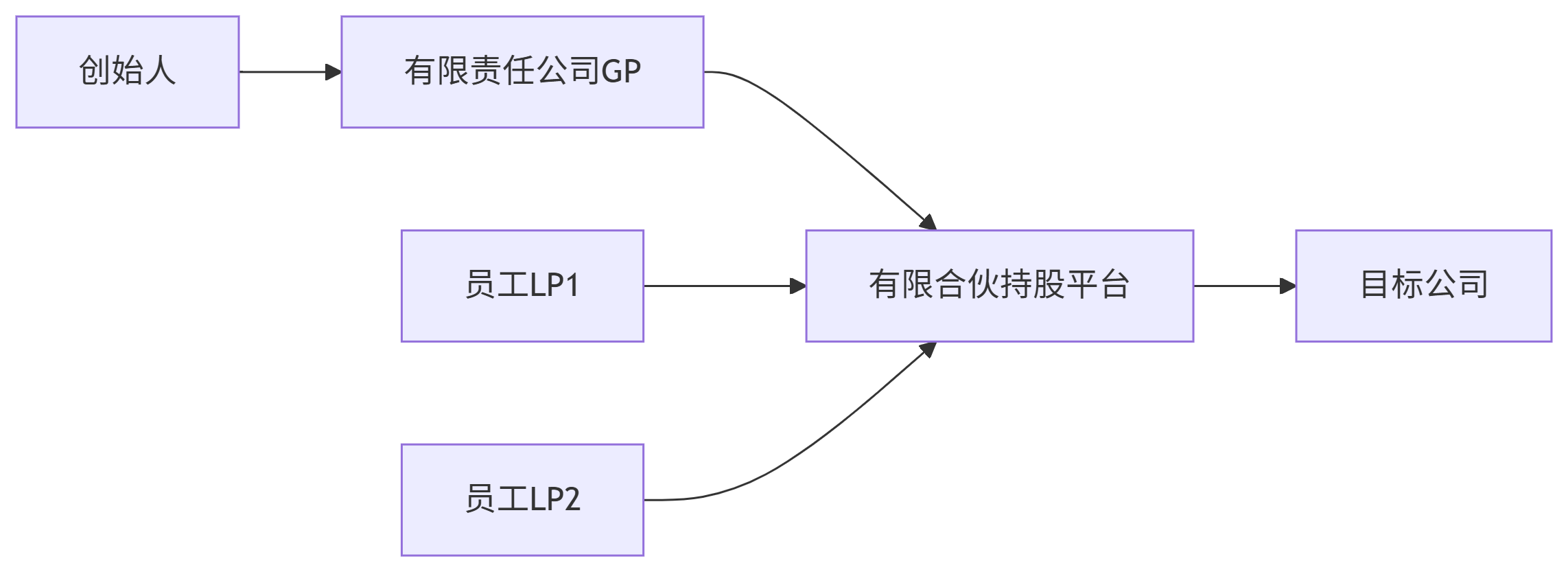 - 說明:創(chuàng)始人通過有限責任公司控制GP,員工作為LP通過合伙企業(yè)間接持股目標公司,避免直接工商變更的繁瑣。