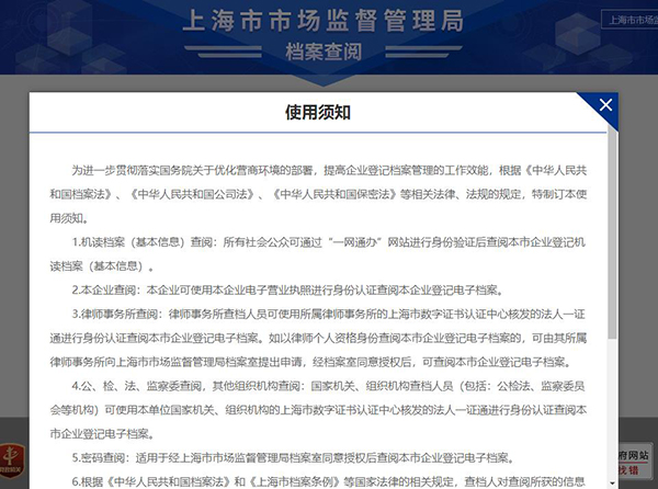 上海市企業(yè)登記檔案查閱辦法 第一條(目的) 為了充分發(fā)揮企業(yè)登記檔案的社會(huì)作用,根據(jù)《中華人民共和國(guó)檔案法》、《中華人民共和國(guó)公司法》、《中華人民共和國(guó)保密法》和《上海市檔案條例》等有關(guān)法律法規(guī),制定本辦法。 第二條(定義) 本辦法所稱的企業(yè)登記檔案是指本市市場(chǎng)監(jiān)管部門依法對(duì)企業(yè)進(jìn)行登記、管理過(guò)程中形成的材料。其中對(duì)企業(yè)登記檔案進(jìn)行摘編所形成的材料,稱之為企業(yè)登記基本資料檔案。 第三條(實(shí)施部門及職責(zé)) 上海市工商行政管理局檔案室和各區(qū)市場(chǎng)監(jiān)管局檔案室具體開展企業(yè)登記檔案的查閱利用工作。 上海市工商行政管理局信息中心負(fù)責(zé)企業(yè)登記網(wǎng)上電子化檔案查閱的相關(guān)技術(shù)支持和保障工作。 第四條(查閱方式) 本市企業(yè)登記檔案通過(guò)計(jì)算機(jī)系統(tǒng)采取電子化查閱的方法。除需要鑒定字跡或印鑒外,不再提供紙質(zhì)原件進(jìn)行查閱。 第五條(企業(yè)登記檔案的類別和內(nèi)容) (一)企業(yè)登記基本資料檔案。包括:企業(yè)名稱、公司注冊(cè)號(hào)、住所/營(yíng)業(yè)場(chǎng)所、法定代表人/負(fù)責(zé)人姓名、注冊(cè)資本/金、出資方式、經(jīng)營(yíng)范圍、公司類型/經(jīng)濟(jì)性質(zhì)、企業(yè)狀態(tài)、營(yíng)業(yè)期限/經(jīng)營(yíng)期限、登記機(jī)關(guān)/受理機(jī)關(guān)、成立日期、最新年檢狀況、股東/發(fā)起人姓名或名稱等。 (二)企業(yè)登記電子化檔案。 1.企業(yè)開業(yè)登記材料:名稱預(yù)先核準(zhǔn)通知書、企業(yè)設(shè)立登記申請(qǐng)書、章程、合同、委派書、聘任書、房屋租賃協(xié)議、董事會(huì)(股東會(huì)、監(jiān)事會(huì))決議等。 2.企業(yè)變更登記材料:企業(yè)名稱、住所、法定代表人、經(jīng)濟(jì)性質(zhì)或企業(yè)類別、注冊(cè)資本、經(jīng)營(yíng)范圍等變更登記材料。 3.企業(yè)注銷登記材料:注銷登記申請(qǐng)書、股東會(huì)或董事會(huì)的決議或決定、核準(zhǔn)注銷通知書等。 4.企業(yè)吊銷材料:行政處罰決定書、公告等。 5.監(jiān)督管理材料:企業(yè)限期整改等日常監(jiān)管材料。 第六條(企業(yè)登記基本資料檔案的查閱對(duì)象) 單位和社會(huì)公眾可以查閱企業(yè)登記基本資料檔案。 第七條(企業(yè)登記電子化檔案的查閱對(duì)象) 下列對(duì)象可以查閱除基本資料檔案以外的其他部分企業(yè)登記電子化檔案: (一)各級(jí)公安機(jī)關(guān)、檢察機(jī)關(guān)、審判機(jī)關(guān)、國(guó)家安全機(jī)關(guān)、紀(jì)檢監(jiān)察機(jī)關(guān)和審計(jì)機(jī)關(guān),可以查閱與自身所處理案件相關(guān)的企業(yè)登記檔案。 (二)受當(dāng)事人委托的律師、基層法律服務(wù)工作者和法律援助機(jī)構(gòu)人員可以查閱與其辦理事項(xiàng)相關(guān)的企業(yè)登記檔案。 (三)公證、仲裁、鑒定等機(jī)構(gòu)可以查閱與其工作內(nèi)容相關(guān)的企業(yè)登記檔案。 (四)企業(yè)可以查閱本企業(yè)的登記檔案。 (五)其他有關(guān)單位因工作關(guān)系需查閱企業(yè)登記檔案的,需經(jīng)檔案所屬機(jī)關(guān)檔案管理部門負(fù)責(zé)人同意方可查閱相關(guān)檔案。 第八條(查閱企業(yè)登記基本資料檔案需要履行的手續(xù)) 查閱企業(yè)登記基本資料檔案,需填寫查檔申請(qǐng)表,并提供本人的有效身份證件。 第九條(查閱企業(yè)登記電子化檔案需要履行的手續(xù)) 本辦法第七條所列人員查閱除基本資料檔案以外的其他企業(yè)登記檔案,需填寫查檔申請(qǐng)表,提交單位出具的注明擬查閱企業(yè)全稱的有效證明并出示查閱人的相關(guān)有效證件,供檔案工作人員查驗(yàn)。 (一)公安機(jī)關(guān)、檢察機(jī)關(guān)、審判機(jī)關(guān)、國(guó)家安全機(jī)關(guān)、紀(jì)檢監(jiān)察機(jī)關(guān)和審計(jì)機(jī)關(guān),應(yīng)當(dāng)由其指定的查閱人提交所在機(jī)關(guān)出具的有效證明并出示本人的有效工作證件。 (二)律師應(yīng)當(dāng)提交所在單位出具的證明并出示本人的律師執(zhí)業(yè)證件;鶎臃煞⻊(wù)工作者應(yīng)當(dāng)提交所在單位出具的證明并出示本人的工作證。法律援助人員應(yīng)當(dāng)提交法律援助機(jī)構(gòu)的指派通知書、介紹信并出示本人有效工作證件。 (三)公證、仲裁等機(jī)構(gòu)工作人員應(yīng)當(dāng)提交所在機(jī)構(gòu)出具的有效證明并出示本人的有效執(zhí)業(yè)證件。 (四)鑒定等機(jī)構(gòu)工作人員應(yīng)當(dāng)提供有關(guān)單位委托其鑒定的委托書,提交所在機(jī)構(gòu)出具的有效證明,出示本人的有效執(zhí)業(yè)證件。 (五)企業(yè)查閱本企業(yè)的登記檔案,應(yīng)當(dāng)提交本企業(yè)出具的說(shuō)明查檔用途的有效介紹信,并出示本企業(yè)有效的營(yíng)業(yè)執(zhí)照(正本或副本)原件及指定查閱人員的有效身份證件。 第十條(特殊企業(yè)登記檔案的利用) 凡涉及特殊企業(yè)的登記檔案,按《保密法》有關(guān)規(guī)定,履行相關(guān)手續(xù)后,方可提供查閱利用。 第十一條(查閱場(chǎng)地及對(duì)利用者的要求) 查閱