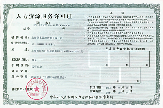 上海人力資源服務(wù)許可證辦理的條件、材料及收費標(biāo)準(zhǔn)如下: 一、上海人力資源服務(wù)許可證辦理條件 1.注冊資本:實繳注冊資本不低于10萬元人民幣。 2.經(jīng)營場所:需有固定經(jīng)營場所,面積不少于50平方米,且為商業(yè)用途。 3.人員要求:至少5名專職工作人員,具備大專以上學(xué)歷,部分區(qū)域要求持有相關(guān)從業(yè)資格證書,且需繳納社保。 4.管理制度:建立健全的工作章程、管理制度、服務(wù)流程及收費標(biāo)準(zhǔn)等。 5.企業(yè)及法人信用:企業(yè)及法定代表人無不良信用記錄。 二、上海人力資源服務(wù)許可證辦理申請材料 1.基礎(chǔ)材料:《人力資源服務(wù)許可申請表》、營業(yè)執(zhí)照副本復(fù)印件、法定代表人身份證明、經(jīng)營場所使用證明(房產(chǎn)證或租賃合同)。 2.人員材料:從業(yè)人員名單及學(xué)歷證明、主要負(fù)責(zé)人工作經(jīng)歷證明、從業(yè)人員職業(yè)資格證書、員工勞動合同及社保繳納證明。 3.管理材料:機構(gòu)章程和管理制度、服務(wù)流程和收費標(biāo)準(zhǔn)、信息化管理系統(tǒng)說明、誠信承諾書。 4.其他材料:銀行資信證明等。 三、上海人力資源服務(wù)許可證辦理收費標(biāo)準(zhǔn) 上海人力資源服務(wù)許可證辦理本身不收取審批費用。但需注意以下可能產(chǎn)生的費用: 1.場地費用:若需租賃辦公場地,費用根據(jù)市場行情而定,一般50平方米的商用辦公場地月租金在3000-10000元左右,具體因區(qū)域和地段而異。 2.人員社保費用:為專職人員繳納社保,費用根據(jù)員工工資基數(shù)和社保繳納比例計算,一般每月人均社保費用在2000-5000元左右。 3.代辦服務(wù)費用:若委托專業(yè)機構(gòu)代辦,費用通常在2000-7000元左右,具體取決于服務(wù)內(nèi)容和機構(gòu)收費標(biāo)準(zhǔn)。 注意事項: · 辦理過程中需確保材料真實有效,避免因材料造假導(dǎo)致申請失敗或被列入黑名單。 · 部分區(qū)域(如浦東新區(qū)、臨港新片區(qū))可能有特殊政策或優(yōu)惠,建議提前咨詢當(dāng)?shù)厝松绮块T。 · 許可證有效期為5年,期滿前30日需辦理延續(xù)手續(xù),公司名稱、地址、注冊資本等變更時,也需在30日內(nèi)辦理變更登記。建議在辦理前充分了解最新政策要求,可咨詢專業(yè)服務(wù)機構(gòu)或當(dāng)?shù)厝松绮块T,確保順利辦理。 |