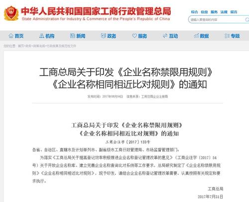 《企業(yè)名稱禁限用規(guī)則》 第一章 總則 第一條為規(guī)范企業(yè)名稱審核行為,建立、完善企業(yè)名稱比對系統(tǒng),為申請人提供更加便利的企業(yè)名稱登記、核準服務(wù),根據(jù)《公司法》《企業(yè)法人登記管理條例》《公司登記管理條例》《企業(yè)名稱登記管理規(guī)定》《企業(yè)名稱登記管理實施辦法》和工商總局有關(guān)規(guī)范性文件等制定本規(guī)則。 第二條本規(guī)則適用于企業(yè)名稱登記、核準有關(guān)業(yè)務(wù)。企業(yè)名稱審核人員依據(jù)本規(guī)則對企業(yè)名稱申請是否存在有關(guān)禁限用內(nèi)容進行審查,按照有關(guān)規(guī)定作出核準或者駁回的決定。 第三條企業(yè)登記機關(guān)可以依據(jù)本規(guī)則建立、完善企業(yè)名稱比對系統(tǒng),為申請人提供企業(yè)名稱篩查服務(wù)。企業(yè)名稱自主申報改革試點地區(qū)可以參照本規(guī)則,建立、完善比對、申報系統(tǒng),為申請人提供自主申報、自負其責(zé)的登記服務(wù)。 第二章 禁止性規(guī)則 第四條 企業(yè)名稱不得與同一企業(yè)登記機關(guān)已登記注冊、核準的同行業(yè)企業(yè)名稱相同。 以下情形適用于本條款規(guī)定: (一)與同一登記機關(guān)已登記、或者已核準但尚未登記且仍在有效期內(nèi)、或者已申請尚未核準的同行業(yè)企業(yè)名稱相同; (二)與辦理注銷登記未滿1年的同行業(yè)企業(yè)名稱相同; (三)與同一登記機關(guān)企業(yè)變更名稱未滿1年的原同行業(yè)名稱相同; (四)與被撤銷設(shè)立登記和被吊銷營業(yè)執(zhí)照尚未辦理注銷登記的同行業(yè)企業(yè)名稱相同。 第五條 企業(yè)名稱不得含有有損于國家、社會公共利益的內(nèi)容和文字。 以下情形適用于本條款規(guī)定: (一)有消極或不良政治影響的。如“支那”“黑太陽”“大地主”等。 (二)宣揚恐怖主義、分裂主義和極端主義的。如“九一一”“東突”“占中”等。 (三)帶有 殖民文化色彩,有損民族尊嚴和傷害人民感情的。如“大東亞”“大和”“ 福爾摩薩”等。 (四)帶有種族、民族、性別等歧視傾向的。如“黑鬼”等。 (五)含有封建文化糟粕、違背社會良好風(fēng)尚或不尊重民族風(fēng)俗習(xí)慣的。如“鬼都”“妻妾成群”等。 (六)涉及毒品、淫穢、色情、暴力、賭博的。如“海洛因”“推牌九”等。 第六條 企業(yè)名稱不得含有可能對公眾造成欺騙或者誤解的內(nèi)容和文字。 以下情形適用于本條款規(guī)定: (一)含有黨和國家領(lǐng)導(dǎo)人、老一輩革命家、知名烈士和知名模范的姓名的。如“董存瑞”“雷鋒”等。 (二)含有非法組織名稱或者反動政治人物、公眾熟知的反面人物的姓名的。如“汪精衛(wèi)”“秦檜”等。 (三)含有宗教組織名稱或帶有顯著宗教色彩的。如“基督教”“佛教”“伊斯蘭教”等。 第七條 企業(yè)名稱不得含有外國國家(地區(qū))名稱、國際組織名稱。 第八條 企業(yè)名稱不得含有政黨名稱、黨政軍機關(guān)名稱、群團組織名稱、社會組織名稱及部隊番號。 第九條 企業(yè)名稱應(yīng)當(dāng)使用符合國家規(guī)范的漢字,不得使用外文、字母和阿拉伯?dāng)?shù)字。 第十條 企業(yè)名稱不得含有其他法律、 行政法規(guī)規(guī)定禁止的內(nèi)容和文字。第十一條企業(yè)名稱應(yīng)當(dāng)由行政區(qū)劃、字號、行業(yè)、組織形式依次組成。企業(yè)名稱中的行政區(qū)劃是本企業(yè)所在地縣級以上行政區(qū)劃的名稱或地名。 市轄區(qū)的名稱不能單獨用作企業(yè)名稱中的行政區(qū)劃。 第十二條 企業(yè)名稱中的字號應(yīng)當(dāng)由2個以上的符合國家規(guī)范的漢字組成,行政區(qū)劃、行業(yè)、組織形式不得用作字號。 第十三條企業(yè)應(yīng)當(dāng)根據(jù)其主營業(yè)務(wù),依照國家行業(yè)分類標(biāo)準劃分的類別,在企業(yè)名稱中標(biāo)明所屬行業(yè)或者經(jīng)營特點。國家法律、法規(guī)以及國務(wù)院決定等對企業(yè)名稱中的行業(yè)有特殊要求的,應(yīng)當(dāng)在企業(yè)名稱中標(biāo)明。不得在企業(yè)名稱中標(biāo)示國家法律、法規(guī)以及國務(wù)院決定等禁止經(jīng)營的行業(yè)。 第十四條企業(yè)應(yīng)當(dāng)根據(jù)其組織結(jié)構(gòu)或者責(zé)任形式在名稱中標(biāo)明符合國家法律、法規(guī)以及國務(wù)院決定規(guī)定的組織形式,不得使用與其組織結(jié)構(gòu)或者責(zé)任形式不一致的組織形式。 第三章 限制性規(guī)則 第十五條 企業(yè)名稱不得與同一企業(yè)登記機關(guān)已登記注冊、核準的同行業(yè)企業(yè)名稱近似,但有投資關(guān)系的除外。 第十六條 企業(yè)法人名稱中不得含有其 他非營利法人的名稱,但有投資關(guān)系或者經(jīng)該法人授權(quán),且使用該法人簡稱或者特定稱謂的除外。該法人的簡稱或者特定稱謂有其他含義或者指向不確定的,可以不經(jīng)授權(quán)。 第十七條企業(yè)名稱中不得含有另一個企業(yè)名稱,但有投資關(guān)系或者經(jīng)該企業(yè)授權(quán),且使用該企業(yè)的簡稱或者特定稱謂的除外。該企業(yè)的簡稱或者特定稱謂有其他含義或者指向不確定的,可以不經(jīng)授權(quán)。 第十八條 企業(yè)名稱不得明示或者