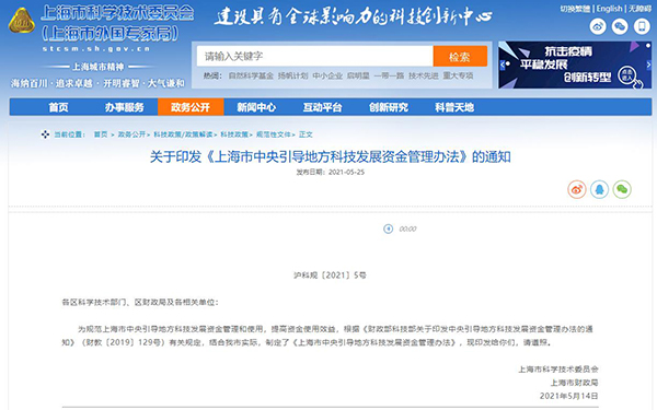 上海市中央引導(dǎo)地方科技發(fā)展資金管理辦法 第一章 總 則 第一條(目的依據(jù)) 為規(guī)范上海市中央引導(dǎo)地方科技發(fā)展資金管理,提高引導(dǎo)資金使用效益,推進(jìn)本市科技創(chuàng)新驅(qū)動發(fā)展,根據(jù)《中央引導(dǎo)地方科技發(fā)展資金管理辦法》(財教〔2019〕129號)的規(guī)定,結(jié)合本市實際,制定本辦法。 第二條(適用范圍) 上海市中央引導(dǎo)地方科技發(fā)展資金(以下簡稱引導(dǎo)資金)是指中央財政用于支持和引導(dǎo)本市落實國家創(chuàng)新驅(qū)動發(fā)展戰(zhàn)略和科技改革發(fā)展政策、優(yōu)化區(qū)域科技創(chuàng)新環(huán)境、提升區(qū)域科技創(chuàng)新能力的中央和地方共同財政事權(quán)轉(zhuǎn)移支付資金。 第三條(管理原則) 引導(dǎo)資金管理遵循“中央引導(dǎo)、省級統(tǒng)籌,簡政放權(quán)、激發(fā)活力,聚焦重點、突出績效”的原則。 第二章 組織管理和職責(zé) 第四條(管理部門) 引導(dǎo)資金由上海市科學(xué)技術(shù)委員會(以下簡稱市科委)和上海市財政局(以下簡稱市財政局)共同負(fù)責(zé)管理。 市科委負(fù)責(zé)制定中央引導(dǎo)地方科技發(fā)展資金相關(guān)管理政策,根據(jù)中央財政下達(dá)的年度預(yù)算,會同市財政局合理分配預(yù)算,制定年度引導(dǎo)資金實施方案,負(fù)責(zé)資金跟蹤管理、績效評價及日常監(jiān)管。 市財政局根據(jù)預(yù)算管理相關(guān)規(guī)定,負(fù)責(zé)引導(dǎo)資金的預(yù)算下達(dá)、資金撥付等工作,并會同市科委對專項資金使用情況進(jìn)行監(jiān)督檢查、績效評價。 第五條(使用引導(dǎo)資金的單位職責(zé)) 使用引導(dǎo)資金的單位作為項目的承擔(dān)單位,是使用引導(dǎo)資金的責(zé)任主體,主要職責(zé)是:嚴(yán)格執(zhí)行引導(dǎo)資金各項管理規(guī)定,建立健全科研、財務(wù)、誠信等內(nèi)部管理制度;切實履行法人責(zé)任,規(guī)范管理使用資金,接受市科委等相關(guān)部門的指導(dǎo)、檢查并配合開展績效評價、監(jiān)督檢查和驗收等工作;項目下設(shè)課題的,課題承擔(dān)單位須接受項目承擔(dān)單位的指導(dǎo)、協(xié)調(diào)和監(jiān)督,對項目承擔(dān)單位負(fù)責(zé)。 第三章 支持范圍與支持方式 第六條(支持范圍) 引導(dǎo)資金支持以下四個方面: (一)自由探索類基礎(chǔ)研究。主要指聚焦探索未知的科學(xué)問題,結(jié)合基礎(chǔ)研究區(qū)域布局,自主設(shè)立的旨在開展自由探索類基礎(chǔ)研究的科技專項、科技基金等。 (二)科技創(chuàng)新基地建設(shè)。主要指符合本市相關(guān)規(guī)劃等建設(shè)的各類科技創(chuàng)新基地,包括依托大學(xué)、科研院所、企業(yè)、轉(zhuǎn)制科研機(jī)構(gòu)設(shè)立的科技創(chuàng)新基地(含省部共建國家重點實驗室、臨床醫(yī)學(xué)研究中心等),以及具有獨立法人資格的產(chǎn)業(yè)技術(shù)研究院、技術(shù)創(chuàng)新中心、新型研發(fā)機(jī)構(gòu)等。 (三)科技成果轉(zhuǎn)移轉(zhuǎn)化。主要指本市針對區(qū)域重點產(chǎn)業(yè)等開展科技成果轉(zhuǎn)移轉(zhuǎn)化活動,包括技術(shù)轉(zhuǎn)移機(jī)構(gòu)、人才隊伍和技術(shù)市場建設(shè),以及公益屬性明顯、引導(dǎo)帶動作用突出、惠及人民群眾廣泛的科技成果轉(zhuǎn)化示范項目等。 (四)區(qū)域創(chuàng)新體系建設(shè)。主要指國家自主創(chuàng)新示范區(qū)、國家科技創(chuàng)新中心、綜合性國家科學(xué)中心、可持續(xù)發(fā)展議程創(chuàng)新示范區(qū)、國家農(nóng)業(yè)高新技術(shù)產(chǎn)業(yè)示范區(qū)、創(chuàng)新型城區(qū)/園區(qū)等區(qū)域創(chuàng)新體系建設(shè),重點支持跨區(qū)域研發(fā)合作和區(qū)域內(nèi)科技型中小企業(yè)科技研發(fā)活動。 第七條(支持方式) 為充分發(fā)揮資金的引導(dǎo)作用,提高資金使用效率,引導(dǎo)資金采用事前直接補(bǔ)助或事后補(bǔ)助等方式予以支持。支持自由探索類基礎(chǔ)研究、科技創(chuàng)新基地建設(shè)和區(qū)域創(chuàng)新體系建設(shè)的資金,可采用直接補(bǔ)助、后補(bǔ)助、以獎代補(bǔ)等多種投入方式。支持科技成果轉(zhuǎn)移轉(zhuǎn)化的資金,可采用風(fēng)險補(bǔ)償、后補(bǔ)助、創(chuàng)投引導(dǎo)等財政投入方式。 第八條(資金禁用) 引導(dǎo)資金不得用于支付各種罰款、捐款、贊助、投資、償還債務(wù)等支出,不得用于行政事業(yè)單位編制內(nèi)在職人員工資性支出和離退休人員離退休費,以及國家、本市規(guī)定禁止列支的其他支出。 第四章 項目和預(yù)算管理 第九條(項目申報) 市科委、市財政局按照科技部、財政部的要求,圍繞國家和本市科技創(chuàng)新發(fā)展目標(biāo)和年度工作重點征集項目。項目申請單位按照相關(guān)申報要求,向市科委提交申請材料。 第十條(項目評審) 市科委會同市財政局,參照本市科技計劃管理的相關(guān)規(guī)定,組織專家或委托第三方專業(yè)機(jī)構(gòu)進(jìn)行項目評審工作,確定擬支持項目。 第十一條(項目公示) 市科委和市財政局對擬使用引導(dǎo)資金資助的項目通過官方網(wǎng)站等媒介向社會公示,公示期不少于7日。 第十二條(方案報送) 市科委會同市財政局編制年度引導(dǎo)資