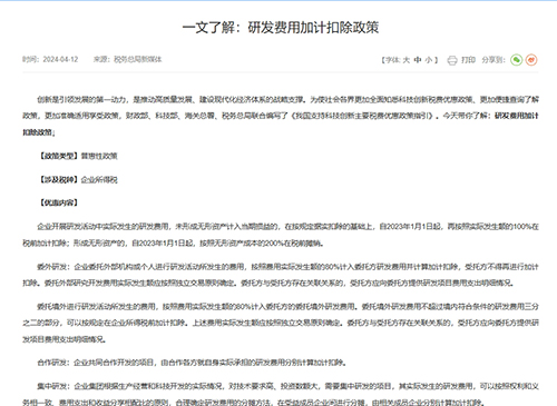 一、研發(fā)費(fèi)用加計(jì)扣除政策的適用范圍 【適用行業(yè)】 除煙草制造業(yè)、住宿和餐飲業(yè)、批發(fā)和零售業(yè)、房地產(chǎn)業(yè)、租賃和商務(wù)服務(wù)業(yè)、娛樂業(yè)以外,其他企業(yè)均可享受 【適用活動】 企業(yè)為獲得科學(xué)與技術(shù)新知識,創(chuàng)造性運(yùn)用科學(xué)技術(shù)新知識,或?qū)嵸|(zhì)性改進(jìn)技術(shù)、產(chǎn)品(服務(wù))、工藝而持續(xù)進(jìn)行的具有明確目標(biāo)的系統(tǒng)性活動。 下列活動不適用稅前加計(jì)扣除政策: 1.企業(yè)產(chǎn)品(服務(wù))的常規(guī)性升級。 2.對某項(xiàng)科研成果的直接應(yīng)用,如直接采用公開的新工藝、材料、裝置、產(chǎn)品、服務(wù)或知識等。 3.企業(yè)在商品化后為顧客提供的技術(shù)支持活動。 4.對現(xiàn)存產(chǎn)品、服務(wù)、技術(shù)、材料或工藝流程進(jìn)行的重復(fù)或簡單改變。 5.市場調(diào)查研究、效率調(diào)查或管理研究。 6.作為工業(yè)(服務(wù))流程環(huán)節(jié)或常規(guī)的質(zhì)量控制、測試分析、維修維護(hù)。 7.社會科學(xué)、藝術(shù)或人文學(xué)方面的研究。 【政策依據(jù)】 《財(cái)政部 國家稅務(wù)總局 科技部關(guān)于完善研究開發(fā)費(fèi)用稅前加計(jì)扣除政策的通知》(財(cái)稅〔2015〕119號) 二、除制造業(yè)外的企業(yè)研發(fā)費(fèi)用按75%加計(jì)扣除 【適用主體】 除制造業(yè)以外的企業(yè),且不屬于煙草制造業(yè)、住宿和餐飲業(yè)、批發(fā)和零售業(yè)、房地產(chǎn)業(yè)、租賃和商務(wù)服務(wù)業(yè)、娛樂業(yè)。 【優(yōu)惠內(nèi)容】 企業(yè)開展研發(fā)活動中實(shí)際發(fā)生的研發(fā)費(fèi)用,未形成無形資產(chǎn)計(jì)入當(dāng)期損益的,在2023年12月31日前,在按規(guī)定據(jù)實(shí)扣除的基礎(chǔ)上,再按照實(shí)際發(fā)生額的75%在稅前加計(jì)扣除;形成無形資產(chǎn)的,在上述期間按照無形資產(chǎn)成本的175%在稅前攤銷。 【政策依據(jù)】 1.《財(cái)政部 稅務(wù)總局 科技部關(guān)于提高研究開發(fā)費(fèi)用稅前加計(jì)扣除比例的通知》(財(cái)稅〔2018〕99號) 2.《財(cái)政部 稅務(wù)總局關(guān)于延長部分稅收優(yōu)惠政策執(zhí)行期限的公告》(2021年第6號) 三、制造業(yè)企業(yè)研發(fā)費(fèi)用加計(jì)扣除比例提高到100% 【適用主體】 制造業(yè)企業(yè) 【優(yōu)惠內(nèi)容】 制造業(yè)企業(yè)開展研發(fā)活動中實(shí)際發(fā)生的研發(fā)費(fèi)用,未形成無形資產(chǎn)計(jì)入當(dāng)期損益的,在按規(guī)定據(jù)實(shí)扣除的基礎(chǔ)上,自2021年1月1日起,再按照實(shí)際發(fā)生額的100%在稅前加計(jì)扣除;形成無形資產(chǎn)的,自2021年1月1日起,按照無形資產(chǎn)成本的200%在稅前攤銷。 【政策依據(jù)】 1.《財(cái)政部 國家稅務(wù)總局 科技部關(guān)于完善研究開發(fā)費(fèi)用稅前加計(jì)扣除政策的通知》(財(cái)稅〔2015〕119號) 2.《財(cái)政部 稅務(wù)總局 科技部關(guān)于企業(yè)委托境外研究開發(fā)費(fèi)用稅前加計(jì)扣除有關(guān)政策問題的通知》(財(cái)稅〔2018〕64號) 3.《財(cái)政部 稅務(wù)總局關(guān)于進(jìn)一步完善研發(fā)費(fèi)用稅前加計(jì)扣除政策的公告》(2021年第13號) 四、多業(yè)經(jīng)營企業(yè)是否屬于制造業(yè)企業(yè)的判定 【適用主體】 既有制造業(yè)收入,又有其他業(yè)務(wù)收入的企業(yè) 【判定標(biāo)準(zhǔn)】 以制造業(yè)業(yè)務(wù)為主營業(yè)務(wù),享受優(yōu)惠當(dāng)年主營業(yè)務(wù)收入占收入總額的比例在50%以上的,為制造業(yè)企業(yè)。制造業(yè)收入占收入總額的比例低于50%的,為其他企業(yè)。 收入總額按照《企業(yè)所得稅法》第六條規(guī)定執(zhí)行,具體是指企業(yè)以貨幣形式和非貨幣形式從各種來源取得的收入,包括銷售貨物收入、提供勞務(wù)收入、轉(zhuǎn)讓財(cái)產(chǎn)收入、股息紅利等權(quán)益性投資收益、利息收入、租金收入、特許權(quán)使用費(fèi)收入、接受捐贈收入、其他收入。 【政策依據(jù)】 《財(cái)政部 稅務(wù)總局關(guān)于進(jìn)一步完善研發(fā)費(fèi)用稅前加計(jì)扣除政策的公告》(2021年第13號) 五、10月份預(yù)繳申報(bào)可提前享受上半年研發(fā)費(fèi)用加計(jì)扣除優(yōu)惠 【適用主體】 除煙草制造業(yè)、住宿和餐飲業(yè)、批發(fā)和零售業(yè)、房地產(chǎn)業(yè)、租賃和商務(wù)服務(wù)業(yè)、娛樂業(yè)以外的其他行業(yè)企業(yè) 【優(yōu)惠內(nèi)容】 1.從2021年1月1日起,企業(yè)10月份預(yù)繳申報(bào)當(dāng)年第3季度(按季預(yù)繳)或9月份(按月預(yù)繳)企業(yè)所得稅時(shí),可以自行選擇就當(dāng)年上半年研發(fā)費(fèi)用享受加計(jì)扣除優(yōu)惠政策。 采取“自行判別、申報(bào)享受、相關(guān)資料留存?zhèn)洳椤鞭k理方式。符合條件的企業(yè)自行計(jì)算加計(jì)扣除金額,填報(bào)《中華人民共和國企業(yè)所得稅月(季)度預(yù)繳納稅申報(bào)表(A類)》享受稅收優(yōu)惠,并根據(jù)享受加計(jì)扣除優(yōu)惠的研發(fā)費(fèi)用情況(上半年)填寫《研發(fā)費(fèi)用加計(jì)扣除優(yōu)惠明細(xì)表》(A107012)(不需報(bào)送稅務(wù)
