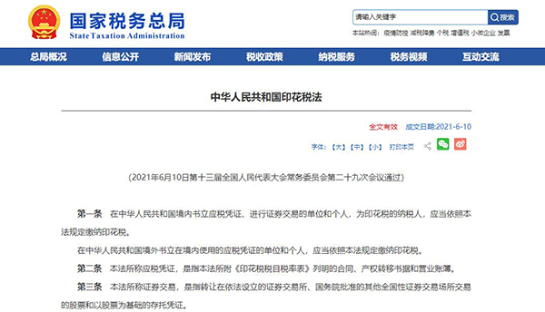 中華人民共和國印花稅法 第一條 在中華人民共和國境內(nèi)書立應(yīng)稅憑證、進行證券交易的單位和個人,為印花稅的納稅人,應(yīng)當(dāng)依照本法規(guī)定繳納印花稅。 在中華人民共和國境外書立在境內(nèi)使用的應(yīng)稅憑證的單位和個人,應(yīng)當(dāng)依照本法規(guī)定繳納印花稅。 第二條 本法所稱應(yīng)稅憑證,是指本法所附《印花稅稅目稅率表》列明的合同、產(chǎn)權(quán)轉(zhuǎn)移書據(jù)和營業(yè)賬簿。 第三條 本法所稱證券交易,是指轉(zhuǎn)讓在依法設(shè)立的證券交易所、國務(wù)院批準的其他全國性證券交易場所交易的股票和以股票為基礎(chǔ)的存托憑證。 證券交易印花稅對證券交易的出讓方征收,不對受讓方征收。 第四條 印花稅的稅目、稅率,依照本法所附《印花稅稅目稅率表》執(zhí)行。 第五條 印花稅的計稅依據(jù)如下: (一)應(yīng)稅合同的計稅依據(jù),為合同所列的金額,不包括列明的增值稅稅款; (二)應(yīng)稅產(chǎn)權(quán)轉(zhuǎn)移書據(jù)的計稅依據(jù),為產(chǎn)權(quán)轉(zhuǎn)移書據(jù)所列的金額,不包括列明的增值稅稅款; (三)應(yīng)稅營業(yè)賬簿的計稅依據(jù),為賬簿記載的實收資本(股本)、資本公積合計金額; (四)證券交易的計稅依據(jù),為成交金額。 第六條 應(yīng)稅合同、產(chǎn)權(quán)轉(zhuǎn)移書據(jù)未列明金額的,印花稅的計稅依據(jù)按照實際結(jié)算的金額確定。 計稅依據(jù)按照前款規(guī)定仍不能確定的,按照書立合同、產(chǎn)權(quán)轉(zhuǎn)移書據(jù)時的市場價格確定;依法應(yīng)當(dāng)執(zhí)行政府定價或者政府指導(dǎo)價的,按照國家有關(guān)規(guī)定確定。 第七條 證券交易無轉(zhuǎn)讓價格的,按照辦理過戶登記手續(xù)時該證券前一個交易日收盤價計算確定計稅依據(jù);無收盤價的,按照證券面值計算確定計稅依據(jù)。 第八條 印花稅的應(yīng)納稅額按照計稅依據(jù)乘以適用稅率計算。 第九條 同一應(yīng)稅憑證載有兩個以上稅目事項并分別列明金額的,按照各自適用的稅目稅率分別計算應(yīng)納稅額;未分別列明金額的,從高適用稅率。 第十條 同一應(yīng)稅憑證由兩方以上當(dāng)事人書立的,按照各自涉及的金額分別計算應(yīng)納稅額。 第十一條 已繳納印花稅的營業(yè)賬簿,以后年度記載的實收資本(股本)、資本公積合計金額比已繳納印花稅的實收資本(股本)、資本公積合計金額增加的,按照增加部分計算應(yīng)納稅額。 第十二條 下列憑證免征印花稅: (一)應(yīng)稅憑證的副本或者抄本; (二)依照法律規(guī)定應(yīng)當(dāng)予以免稅的外國駐華使館、領(lǐng)事館和國際組織駐華代表機構(gòu)為獲得館舍書立的應(yīng)稅憑證; (三)中國人民解放軍、中國人民武裝警察部隊書立的應(yīng)稅憑證; (四)農(nóng)民、家庭農(nóng)場、農(nóng)民專業(yè)合作社、農(nóng)村集體經(jīng)濟組織、村民委員會購買農(nóng)業(yè)生產(chǎn)資料或者銷售農(nóng)產(chǎn)品書立的買賣合同和農(nóng)業(yè)保險合同; (五)無息或者貼息借款合同、國際金融組織向中國提供優(yōu)惠貸款書立的借款合同; (六)財產(chǎn)所有權(quán)人將財產(chǎn)贈與政府、學(xué)校、社會福利機構(gòu)、慈善組織書立的產(chǎn)權(quán)轉(zhuǎn)移書據(jù); (七)非營利性醫(yī)療衛(wèi)生機構(gòu)采購藥品或者衛(wèi)生材料書立的買賣合同; (八)個人與電子商務(wù)經(jīng)營者訂立的電子訂單。 根據(jù)國民經(jīng)濟和社會發(fā)展的需要,國務(wù)院對居民住房需求保障、企業(yè)改制重組、破產(chǎn)、支持小型微型企業(yè)發(fā)展等情形可以規(guī)定減征或者免征印花稅,報全國人民代表大會常務(wù)委員會備案。 第十三條 納稅人為單位的,應(yīng)當(dāng)向其機構(gòu)所在地的主管稅務(wù)機關(guān)申報繳納印花稅;納稅人為個人的,應(yīng)當(dāng)向應(yīng)稅憑證書立地或者納稅人居住地的主管稅務(wù)機關(guān)申報繳納印花稅。 不動產(chǎn)產(chǎn)權(quán)發(fā)生轉(zhuǎn)移的,納稅人應(yīng)當(dāng)向不動產(chǎn)所在地的主管稅務(wù)機關(guān)申報繳納印花稅。 第十四條 納稅人為境外單位或者個人,在境內(nèi)有代理人的,以其境內(nèi)代理人為扣繳義務(wù)人;在境內(nèi)沒有代理人的,由納稅人自行申報繳納印花稅,具體辦法由國務(wù)院稅務(wù)主管部門規(guī)定。 證券登記結(jié)算機構(gòu)為證券交易印花稅的扣繳義務(wù)人,應(yīng)當(dāng)向其機構(gòu)所在地的主管稅務(wù)機關(guān)申報解繳稅款以及銀行結(jié)算的利息。 第十五條 印花稅的納稅義務(wù)發(fā)生時間為納稅人書立應(yīng)稅憑證或者完成證券交易的當(dāng)日。 證券交易印花稅扣繳義務(wù)發(fā)生時間為證券交易完成的當(dāng)日。 第十六條 印花稅按季、按年或者按次計征。實行按季、按年計征的,納稅人應(yīng)當(dāng)自季度、年度終了之日起十五日內(nèi)申報繳納稅款;實行按次計征的,納稅人應(yīng)當(dāng)自納稅義務(wù)發(fā)生之日起十五日內(nèi)申報繳納稅款。 證券交易印花稅按周解繳。證券交易印花稅扣繳義務(wù)人應(yīng)當(dāng)自每周終了之日起五日內(nèi)申報解繳稅款以及銀行結(jié)算的利息。 第十七條 印花稅可以采用粘貼印花稅票或