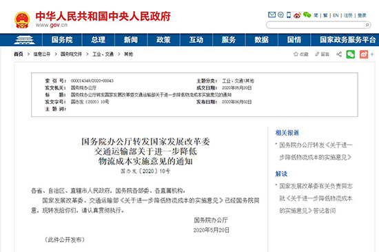 國務(wù)院辦公廳轉(zhuǎn)發(fā)國家發(fā)展改革委 交通運(yùn)輸部關(guān)于進(jìn)一步降低 物流成本實(shí)施意見的通知 國辦發(fā)〔2020〕10號(hào) 各省、自治區(qū)、直轄市人民政府,國務(wù)院各部委、各直屬機(jī)構(gòu): 國家發(fā)展改革委、交通運(yùn)輸部《關(guān)于進(jìn)一步降低物流成本的實(shí)施意見》已經(jīng)國務(wù)院同意,現(xiàn)轉(zhuǎn)發(fā)給你們,請認(rèn)真貫徹執(zhí)行。 國務(wù)院辦公廳 2020年5月20日 (此件公開發(fā)布) 關(guān)于進(jìn)一步降低物流成本的實(shí)施意見 國家發(fā)展改革委 交通運(yùn)輸部 物流是暢通國民經(jīng)濟(jì)循環(huán)的重要環(huán)節(jié)。近年來,物流降本增效積極推進(jìn),社會(huì)物流成本水平保持穩(wěn)步下降,但部分領(lǐng)域物流成本高、效率低等問題仍然突出,特別是受新冠肺炎疫情影響,社會(huì)物流成本出現(xiàn)階段性上升,難以適應(yīng)建設(shè)現(xiàn)代化經(jīng)濟(jì)體系、推動(dòng)高質(zhì)量發(fā)展的要求。為貫徹落實(shí)黨中央、國務(wù)院關(guān)于統(tǒng)籌疫情防控和經(jīng)濟(jì)社會(huì)發(fā)展的決策部署,進(jìn)一步降低物流成本、提升物流效率,加快恢復(fù)生產(chǎn)生活秩序,現(xiàn)提出以下意見。 一、深化關(guān)鍵環(huán)節(jié)改革,降低物流制度成本 (一)完善證照和許可辦理程序。加快運(yùn)輸領(lǐng)域資質(zhì)證照電子化,推動(dòng)線上辦理簽注。優(yōu)化大件運(yùn)輸跨省并聯(lián)許可服務(wù),進(jìn)一步提高審批效率。(交通運(yùn)輸部負(fù)責(zé)) (二)科學(xué)推進(jìn)治理車輛超限超載。深入推進(jìn)治超聯(lián)合執(zhí)法常態(tài)化、制度化,細(xì)化執(zhí)法流程,嚴(yán)格執(zhí)行全國統(tǒng)一的治超執(zhí)法標(biāo)準(zhǔn)。分車型、分階段有序開展治理貨運(yùn)車輛非法改裝工作,逐步淘汰各種不合規(guī)車型。組織開展常壓液體危險(xiǎn)貨物罐車專項(xiàng)治理行動(dòng)。(交通運(yùn)輸部、公安部、工業(yè)和信息化部、市場監(jiān)管總局按職責(zé)分工負(fù)責(zé)) (三)維護(hù)道路貨運(yùn)市場正常秩序。建立嚴(yán)厲打擊高速公路、國省道車匪路霸的常態(tài)化工作機(jī)制,暢通投訴舉報(bào)渠道,重點(diǎn)規(guī)范車輛通行、停車服務(wù)、道路救援等領(lǐng)域市場秩序。(公安部、交通運(yùn)輸部、國家發(fā)展改革委、市場監(jiān)管總局、省級(jí)人民政府按職責(zé)分工負(fù)責(zé)) (四)優(yōu)化城市配送車輛通行?抗芾。持續(xù)推進(jìn)城市綠色貨運(yùn)配送示范工程。完善以綜合物流中心、公共配送中心、末端配送網(wǎng)點(diǎn)為支撐的三級(jí)配送網(wǎng)絡(luò),合理設(shè)置城市配送車輛?垦b卸相關(guān)設(shè)施。鼓勵(lì)發(fā)展共同配送、統(tǒng)一配送、集中配送、分時(shí)配送等集約化配送。改進(jìn)城市配送車輛通行管理工作,明確城市配送車輛的概念范圍,放寬標(biāo)準(zhǔn)化輕微型配送車輛通行限制,對新能源城市配送車輛給予更多通行便利。(交通運(yùn)輸部、商務(wù)部、公安部按職責(zé)分工負(fù)責(zé))研究將城市配送車輛?拷有秷龅亟ㄔO(shè)納入城市建設(shè)和建筑設(shè)計(jì)規(guī)范。(住房城鄉(xiāng)建設(shè)部負(fù)責(zé)) (五)推進(jìn)通關(guān)便利化。推動(dòng)港口、口岸等場所作業(yè)單證無紙化,壓縮單證流轉(zhuǎn)時(shí)間,提升貨物進(jìn)出港效率。依托國際貿(mào)易“單一窗口”,開展監(jiān)管、查驗(yàn)指令信息與港口信息雙向交互試點(diǎn),提高進(jìn)出口貨物提離速度。持續(xù)推進(jìn)進(jìn)出口“提前申報(bào)”,優(yōu)化“兩步申報(bào)”通關(guān)模式。梳理海運(yùn)、通關(guān)環(huán)節(jié)審批管理事項(xiàng)和監(jiān)管證件,對不合理或不能適應(yīng)監(jiān)管需要的,按規(guī)定予以取消或退出口岸驗(yàn)核。(交通運(yùn)輸部、商務(wù)部、海關(guān)總署按職責(zé)分工負(fù)責(zé)) (六)深化鐵路市場化改革。選取鐵路路網(wǎng)密集、貨運(yùn)需求量大、運(yùn)輸供求矛盾較突出的地區(qū)和部分重要鐵路貨運(yùn)線路(含疏運(yùn)體系)開展鐵路市場化改革綜合試點(diǎn),通過引入市場競爭機(jī)制,開展投融資、規(guī)劃建設(shè)、運(yùn)營管理、績效管理、運(yùn)輸組織等改革。持續(xù)完善鐵路貨物運(yùn)輸價(jià)格靈活調(diào)整機(jī)制,及時(shí)靈敏反映市場供求關(guān)系。進(jìn)一步放寬市場準(zhǔn)入,吸引社會(huì)資本參與鐵路貨運(yùn)場站、倉儲(chǔ)等物流設(shè)施建設(shè)和運(yùn)營。(國家發(fā)展改革委、交通運(yùn)輸部、財(cái)政部、國家鐵路局、中國國家鐵路集團(tuán)有限公司負(fù)責(zé)) 二、加強(qiáng)土地和資金保障,降低物流要素成本 (七)保障物流用地需求。對國家及有關(guān)部門、。ㄗ灾螀^(qū)、直轄市)確定的國家物流樞紐、鐵路專用線、冷鏈物流設(shè)施等重大物流基礎(chǔ)設(shè)施項(xiàng)目,在建設(shè)用地指標(biāo)方面給予重點(diǎn)保障。支持利用鐵路劃撥用地等存量土地建設(shè)物流設(shè)施。指導(dǎo)地方按照有關(guān)規(guī)定利用集體經(jīng)營性建設(shè)用地建設(shè)物流基礎(chǔ)設(shè)施。(自然資源部、中國國家鐵路集
