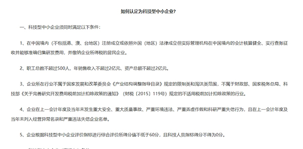 科技型中小企業(yè)評(píng)價(jià)辦法 第一章總則 第一條為貫徹落實(shí)《國(guó)家創(chuàng)新驅(qū)動(dòng)發(fā)展戰(zhàn)略綱要》,推動(dòng)大眾創(chuàng)業(yè)萬(wàn)眾創(chuàng)新,加速科技成果產(chǎn)業(yè)化,加大對(duì)科技型中小企業(yè)的精準(zhǔn)支持力度,壯大科技型中小企業(yè)群體,培育新的經(jīng)濟(jì)增長(zhǎng)點(diǎn),根據(jù)《深化科技體制改革實(shí)施方案》要求,制定本辦法。 第二條本辦法所稱的科技型中小企業(yè)是指依托一定數(shù)量的科技人員從事科學(xué)技術(shù)研究開發(fā)活動(dòng),取得自主知識(shí)產(chǎn)權(quán)并將其轉(zhuǎn)化為高新技術(shù)產(chǎn)品或服務(wù),從而實(shí)現(xiàn)可持續(xù)發(fā)展的中小企業(yè)。 第三條科技型中小企業(yè)評(píng)價(jià)工作采取企業(yè)自主評(píng)價(jià)、省級(jí)科技管理部門組織實(shí)施、科技部服務(wù)監(jiān)督的工作模式,堅(jiān)持服務(wù)引領(lǐng)、放管結(jié)合、公開透明的原則。 第四條科技部負(fù)責(zé)建設(shè)“全國(guó)科技型中小企業(yè)信息服務(wù)平臺(tái)”(以下簡(jiǎn)稱“服務(wù)平臺(tái)”)和“全國(guó)科技型中小企業(yè)信息庫(kù)”(以下簡(jiǎn)稱“信息庫(kù)”)?萍疾炕鹁娓呒夹g(shù)產(chǎn)業(yè)開發(fā)中心負(fù)責(zé)服務(wù)平臺(tái)和信息庫(kù)建設(shè)與運(yùn)行的日常工作。 企業(yè)可根據(jù)本辦法進(jìn)行自主評(píng)價(jià),并按照自愿原則到服務(wù)平臺(tái)填報(bào)企業(yè)信息,經(jīng)公示無(wú)異議的,納入信息庫(kù)。 第五條各有關(guān)部門和各級(jí)人民政府應(yīng)當(dāng)對(duì)納入信息庫(kù)的科技型中小企業(yè)提供精準(zhǔn)支持和精準(zhǔn)服務(wù),制定的支持企業(yè)技術(shù)創(chuàng)新的政策措施應(yīng)優(yōu)先支持納入信息庫(kù)的企業(yè)。 第二章評(píng)價(jià)指標(biāo) 第六條科技型中小企業(yè)須同時(shí)滿足以下條件: (一)在中國(guó)境內(nèi)(不包括港、澳、臺(tái)地區(qū))注冊(cè)的居民企業(yè)。 (二)職工總數(shù)不超過(guò)500人、年銷售收入不超過(guò)2億元、資產(chǎn)總額不超過(guò)2億元。 (三)企業(yè)提供的產(chǎn)品和服務(wù)不屬于國(guó)家規(guī)定的禁止、限制和淘汰類。 (四)企業(yè)在填報(bào)上一年及當(dāng)年內(nèi)未發(fā)生重大安全、重大質(zhì)量事故和嚴(yán)重環(huán)境違法、科研嚴(yán)重失信行為,且企業(yè)未列入經(jīng)營(yíng)異常名錄和嚴(yán)重違法失信企業(yè)名單。 (五)企業(yè)根據(jù)科技型中小企業(yè)評(píng)價(jià)指標(biāo)進(jìn)行綜合評(píng)價(jià)所得分值不低于60分,且科技人員指標(biāo)得分不得為0分。 第七條科技型中小企業(yè)評(píng)價(jià)指標(biāo)具體包括科技人員、研發(fā)投入、科技成果三類,滿分100分。 1.科技人員指標(biāo)(滿分20分)。按科技人員數(shù)占企業(yè)職工總數(shù)的比例分檔評(píng)價(jià)。 A.30%(含)以上(20分) B.25%(含)-30%(16分) C.20%(含)-25%(12分) D.15%(含)-20%(8分) E.10%(含)-15%(4分) F.10%以下(0分) 2.研發(fā)投入指標(biāo)(滿分50分)。企業(yè)從(1)、(2)兩項(xiàng)指標(biāo)中選擇一個(gè)指標(biāo)進(jìn)行評(píng)分。 (1)按企業(yè)研發(fā)費(fèi)用總額占銷售收入總額的比例分檔評(píng)價(jià)。 A.6%(含)以上(50分) B.5%(含)-6%(40分) C.4%(含)-5%(30分) D.3%(含)-4%(20分) E.2%(含)-3%(10分) F.2%以下(0分) (2)按企業(yè)研發(fā)費(fèi)用總額占成本費(fèi)用支出總額的比例分檔評(píng)價(jià)。 A.30%(含)以上(50分) B.25%(含)-30%(40分) C.20%(含)-25%(30分) D.15%(含)-20%(20分) E.10%(含)-15%(10分) F.10%以下(0分) 3.科技成果指標(biāo)(滿分30分)。按企業(yè)擁有的在有效期內(nèi)的與主要產(chǎn)品(或服務(wù))相關(guān)的知識(shí)產(chǎn)權(quán)類別和數(shù)量(知識(shí)產(chǎn)權(quán)應(yīng)沒有爭(zhēng)議或糾紛)分檔評(píng)價(jià)。 A.1項(xiàng)及以上Ⅰ類知識(shí)產(chǎn)權(quán)(30分) B.4項(xiàng)及以上Ⅱ類知識(shí)產(chǎn)權(quán)(24分) C.3項(xiàng)Ⅱ類知識(shí)產(chǎn)權(quán)(18分) D.2項(xiàng)Ⅱ類知識(shí)產(chǎn)權(quán)(12分) E.1項(xiàng)Ⅱ類知識(shí)產(chǎn)權(quán)(6分) F.沒有知識(shí)產(chǎn)權(quán)(0分) 第八條符合第六條第(一)~(四)項(xiàng)條件的企業(yè),若同時(shí)符合下列條件中的一項(xiàng),則可直接確認(rèn)符合科技型中小企業(yè)條件: (一)企業(yè)擁有有效期內(nèi)高新技術(shù)企業(yè)資格證書; (二)企業(yè)近五年內(nèi)獲得過(guò)國(guó)家級(jí)科技獎(jiǎng)勵(lì),并在獲獎(jiǎng)單位中排在前三名; (三)企業(yè)擁有經(jīng)認(rèn)定的省部級(jí)以上研發(fā)機(jī)構(gòu); (四)企業(yè)近五年內(nèi)主導(dǎo)制定過(guò)國(guó)際標(biāo)準(zhǔn)、國(guó)家標(biāo)準(zhǔn)或行業(yè)標(biāo)準(zhǔn)。 第九條科技型中小企業(yè)評(píng)價(jià)指標(biāo)的說(shuō)明: (一)企業(yè)科技人員是指企業(yè)直接從事研發(fā)和相關(guān)技術(shù)創(chuàng)新活動(dòng),以及專門從事上述活動(dòng)管理和提供直接服務(wù)的人員,包括在職、兼職和臨時(shí)聘用人員,兼職、臨時(shí)聘用人員全年須在企業(yè)累計(jì)工作6個(gè)月以上。 (二)企業(yè)職工總數(shù)包括企業(yè)在職、兼職和臨時(shí