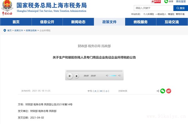 關于生產和裝配傷殘人員專門用品企業(yè)免征企業(yè)所得稅的公告 文號:財政部 稅務總局 民政部公告2021年第14號 發(fā)文單位:財政部 稅務總局 民政部 發(fā)文日期:2021-04-02 為幫助傷殘人員康復或者恢復殘疾肢體功能,現對生產和裝配傷殘人員專門用品的企業(yè)免征企業(yè)所得稅政策明確如下: 一、自2021年1月1日至2023年12月31日期間,對符合下列條件的居民企業(yè),免征企業(yè)所得稅: 1.生產和裝配傷殘人員專門用品,且在民政部發(fā)布的《中國傷殘人員專門用品目錄》范圍之內。 2.以銷售本企業(yè)生產或者裝配的傷殘人員專門用品為主,其所取得的年度傷殘人員專門用品銷售收入(不含出口取得的收入)占企業(yè)收入總額60%以上。 收入總額,是指《中華人民共和國企業(yè)所得稅法》第六條規(guī)定的收入總額。 3.企業(yè)賬證健全,能夠準確、完整地向主管稅務機關提供納稅資料,且本企業(yè)生產或者裝配的傷殘人員專門用品所取得的收入能夠單獨、準確核算。 4.企業(yè)擁有假肢制作師、矯形器制作師資格證書的專業(yè)技術人員不得少于1人;其企業(yè)生產人員如超過20人,則其擁有假肢制作師、矯形器制作師資格證書的專業(yè)技術人員不得少于全部生產人員的1/6。 5.具有與業(yè)務相適應的測量取型、模型加工、接受腔成型、打磨、對線組裝、功能訓練等生產裝配專用設備和工具。 6.具有獨立的接待室、假肢或者矯形器(輔助器具)制作室和假肢功能訓練室,使用面積不少于115平方米。 二、符合本公告規(guī)定條件的企業(yè),按照《國家稅務總局關于發(fā)布修訂后的<企業(yè)所得稅優(yōu)惠政策事項辦理辦法>的公告》(國家稅務總局公告2018年第23號)的規(guī)定,采取“自行判別、申報享受、相關資料留存?zhèn)洳椤钡霓k理方式享受稅收優(yōu)惠政策。 財政部 稅務總局 民政部 2021年4月2日 |