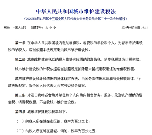 中華人民共和國(guó)城市維護(hù)建設(shè)稅法 (2020年8月11日第十三屆全國(guó)人民代表大會(huì)常務(wù)委員會(huì)第二十一次會(huì)議通過) 第一條在中華人民共和國(guó)境內(nèi)繳納增值稅、消費(fèi)稅的單位和個(gè)人,為城市維護(hù)建設(shè)稅的納稅人,應(yīng)當(dāng)依照本法規(guī)定繳納城市維護(hù)建設(shè)稅。 第二條城市維護(hù)建設(shè)稅以納稅人依法實(shí)際繳納的增值稅、消費(fèi)稅稅額為計(jì)稅依據(jù)。 城市維護(hù)建設(shè)稅的計(jì)稅依據(jù)應(yīng)當(dāng)按照規(guī)定扣除期末留抵退稅退還的增值稅稅額。 城市維護(hù)建設(shè)稅計(jì)稅依據(jù)的具體確定辦法,由國(guó)務(wù)院依據(jù)本法和有關(guān)稅收法律、行政法規(guī)規(guī)定,報(bào)全國(guó)人民代表大會(huì)常務(wù)委員會(huì)備案。 第三條對(duì)進(jìn)口貨物或者境外單位和個(gè)人向境內(nèi)銷售勞務(wù)、服務(wù)、無形資產(chǎn)繳納的增值稅、消費(fèi)稅稅額,不征收城市維護(hù)建設(shè)稅。 第四條城市維護(hù)建設(shè)稅稅率如下: (一)納稅人所在地在市區(qū)的,稅率為百分之七; (二)納稅人所在地在縣城、鎮(zhèn)的,稅率為百分之五; (三)納稅人所在地不在市區(qū)、縣城或者鎮(zhèn)的,稅率為百分之一。 前款所稱納稅人所在地,是指納稅人住所地或者與納稅人生產(chǎn)經(jīng)營(yíng)活動(dòng)相關(guān)的其他地點(diǎn),具體地點(diǎn)由省、自治區(qū)、直轄市確定。 第五條城市維護(hù)建設(shè)稅的應(yīng)納稅額按照計(jì)稅依據(jù)乘以具體適用稅率計(jì)算。 第六條根據(jù)國(guó)民經(jīng)濟(jì)和社會(huì)發(fā)展的需要,國(guó)務(wù)院對(duì)重大公共基礎(chǔ)設(shè)施建設(shè)、特殊產(chǎn)業(yè)和群體以及重大突發(fā)事件應(yīng)對(duì)等情形可以規(guī)定減征或者免征城市維護(hù)建設(shè)稅,報(bào)全國(guó)人民代表大會(huì)常務(wù)委員會(huì)備案。 第七條城市維護(hù)建設(shè)稅的納稅義務(wù)發(fā)生時(shí)間與增值稅、消費(fèi)稅的納稅義務(wù)發(fā)生時(shí)間一致,分別與增值稅、消費(fèi)稅同時(shí)繳納。 第八條城市維護(hù)建設(shè)稅的扣繳義務(wù)人為負(fù)有增值稅、消費(fèi)稅扣繳義務(wù)的單位和個(gè)人,在扣繳增值稅、消費(fèi)稅的同時(shí)扣繳城市維護(hù)建設(shè)稅。 第九條城市維護(hù)建設(shè)稅由稅務(wù)機(jī)關(guān)依照本法和《中華人民共和國(guó)稅收征收管理法》的規(guī)定征收管理。 第十條納稅人、稅務(wù)機(jī)關(guān)及其工作人員違反本法規(guī)定的,依照《中華人民共和國(guó)稅收征收管理法》和有關(guān)法律法規(guī)的規(guī)定追究法律責(zé)任。 第十一條本法自2021年9月1日起施行。1985年2月8日國(guó)務(wù)院發(fā)布的《中華人民共和國(guó)城市維護(hù)建設(shè)稅暫行條例》同時(shí)廢止。 |